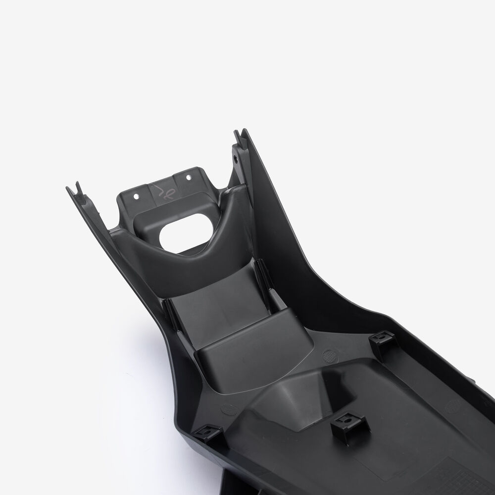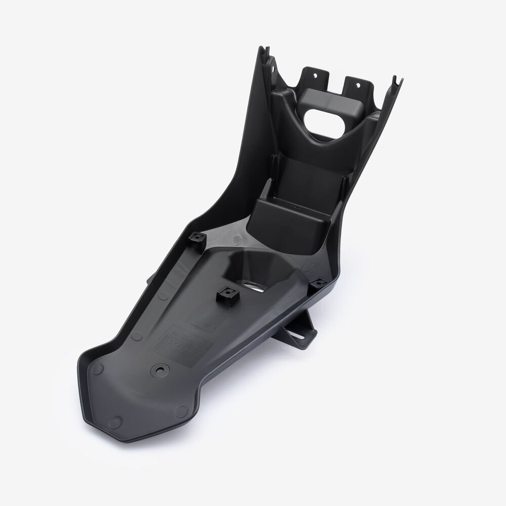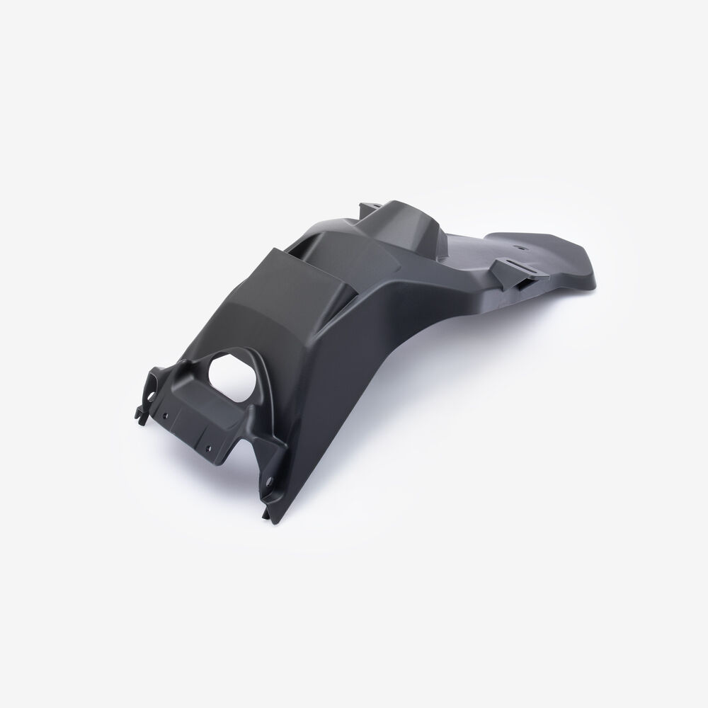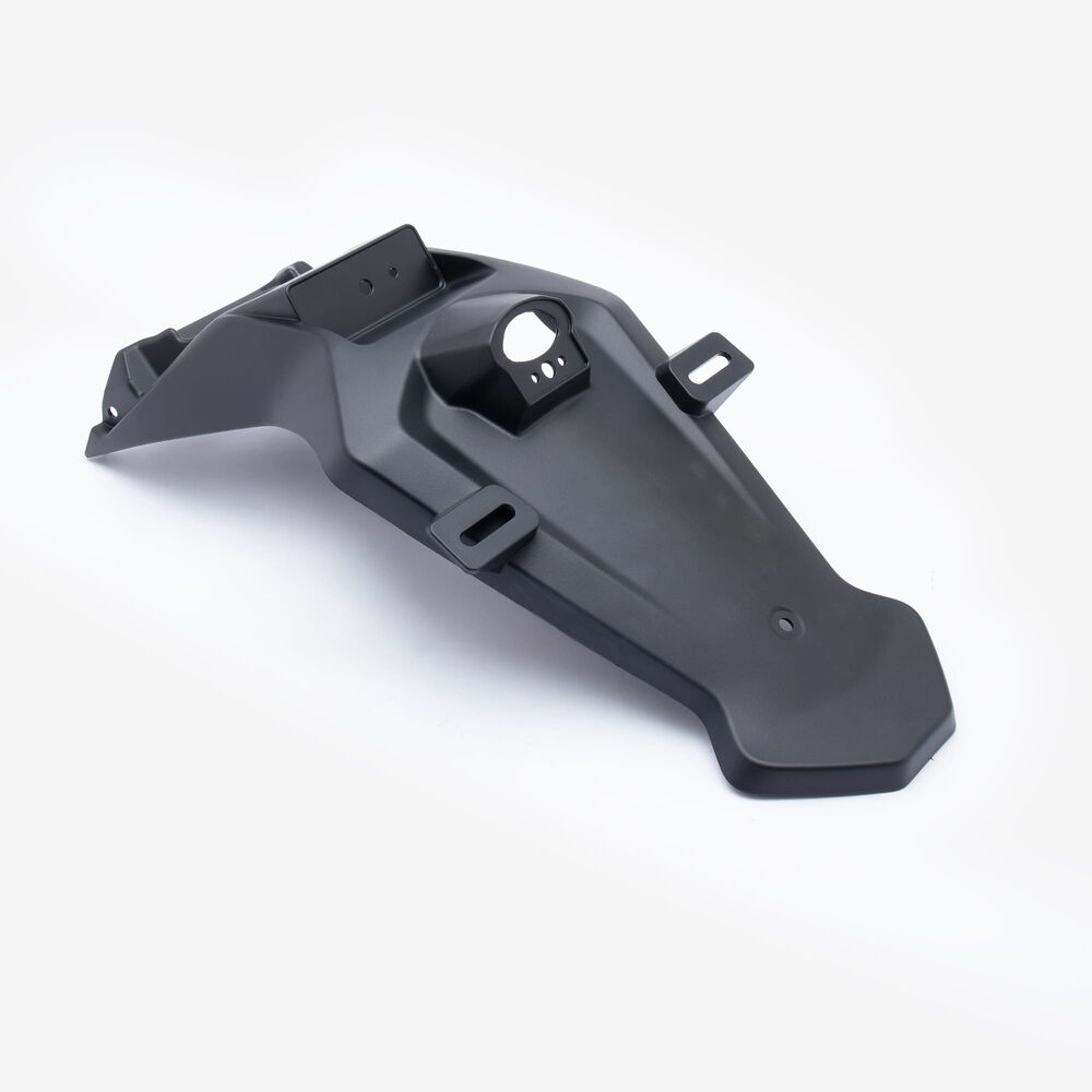 The rear mudguard on a motorcycle is a protective panel mounted above the rear wheel to shield the bike and rider from water, mud, and debris kicked up by the tire. It helps keep the rear of the motorcycle cleaner and improves visibility by preventing splashes.