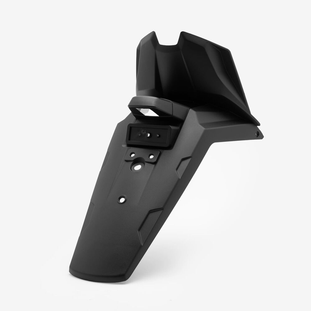 The rear mudguard on a motorcycle is a protective panel mounted above the rear wheel to shield the bike and rider from water, mud, and debris kicked up by the tire. It helps keep the rear of the motorcycle cleaner and improves visibility by preventing splashes.