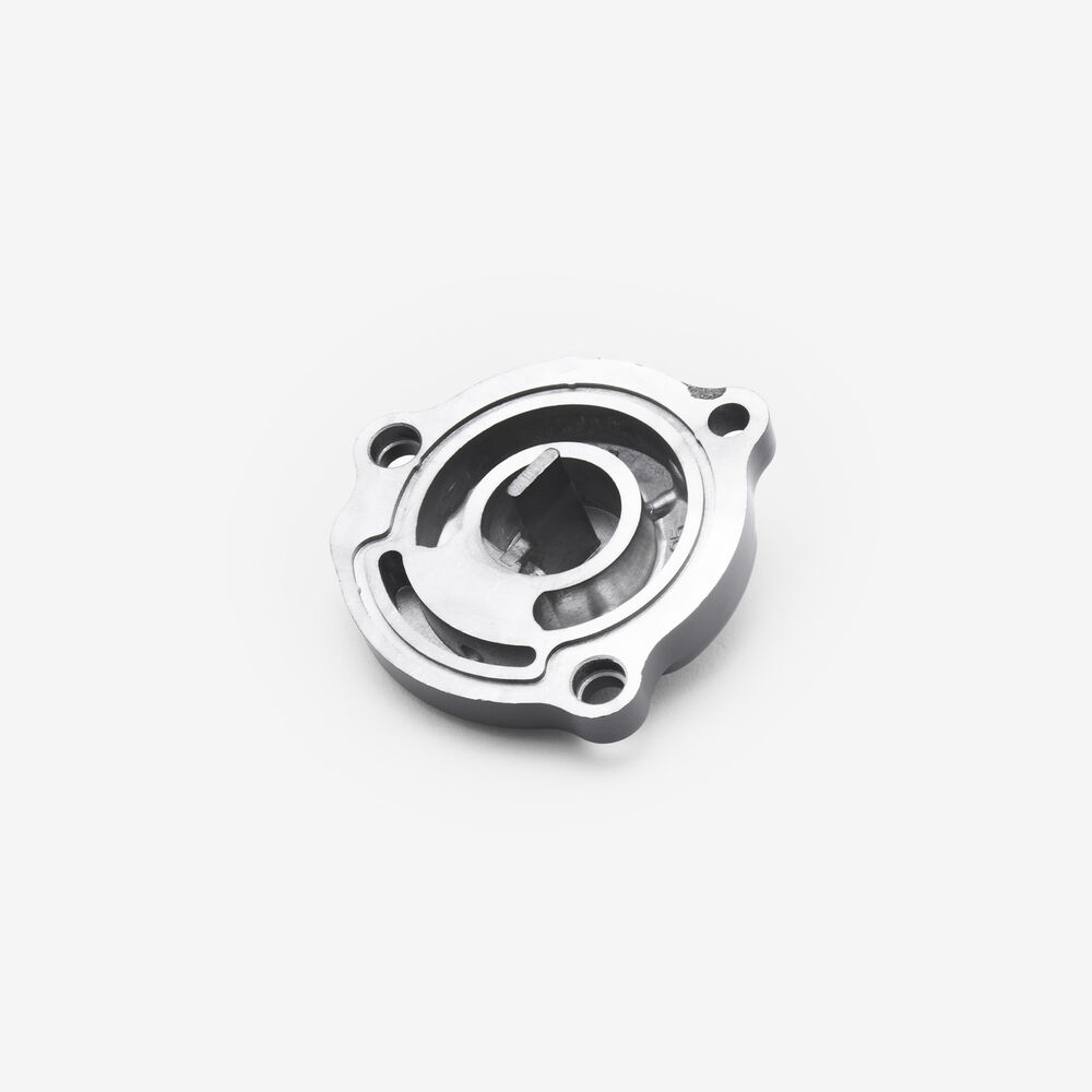 The oil filter cap on a motorcycle is a component that covers and seals the oil filter housing. It ensures that the oil filter is securely held in place and that the engine oil remains contained within the system. Made from metal or durable plastic, the oil filter cap is designed to maintain a tight seal and withstand engine temperatures and pressures, preventing leaks and ensuring proper filtration.