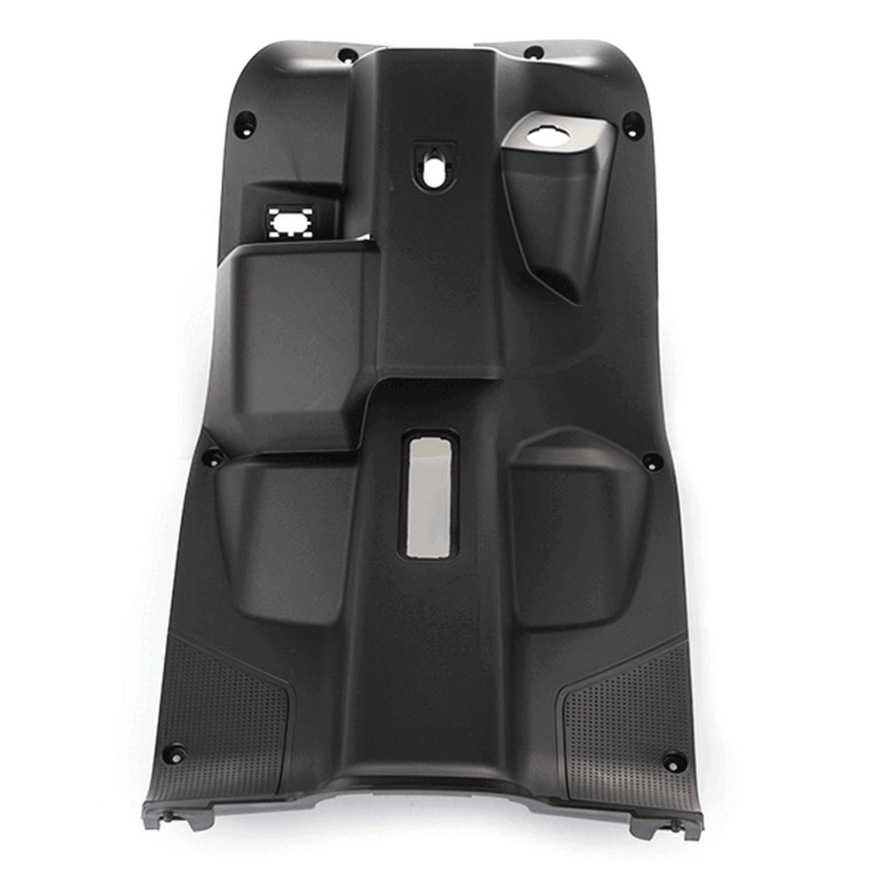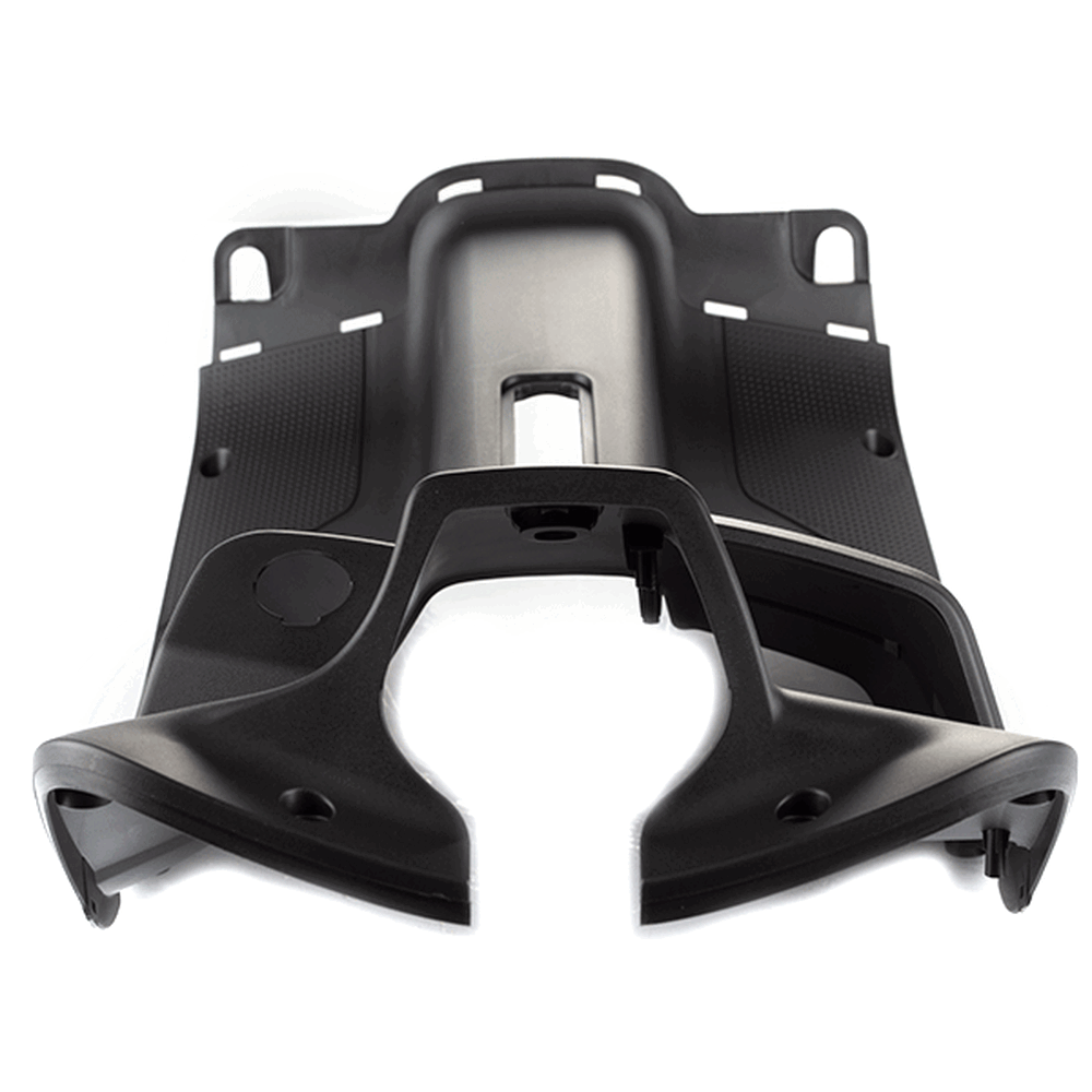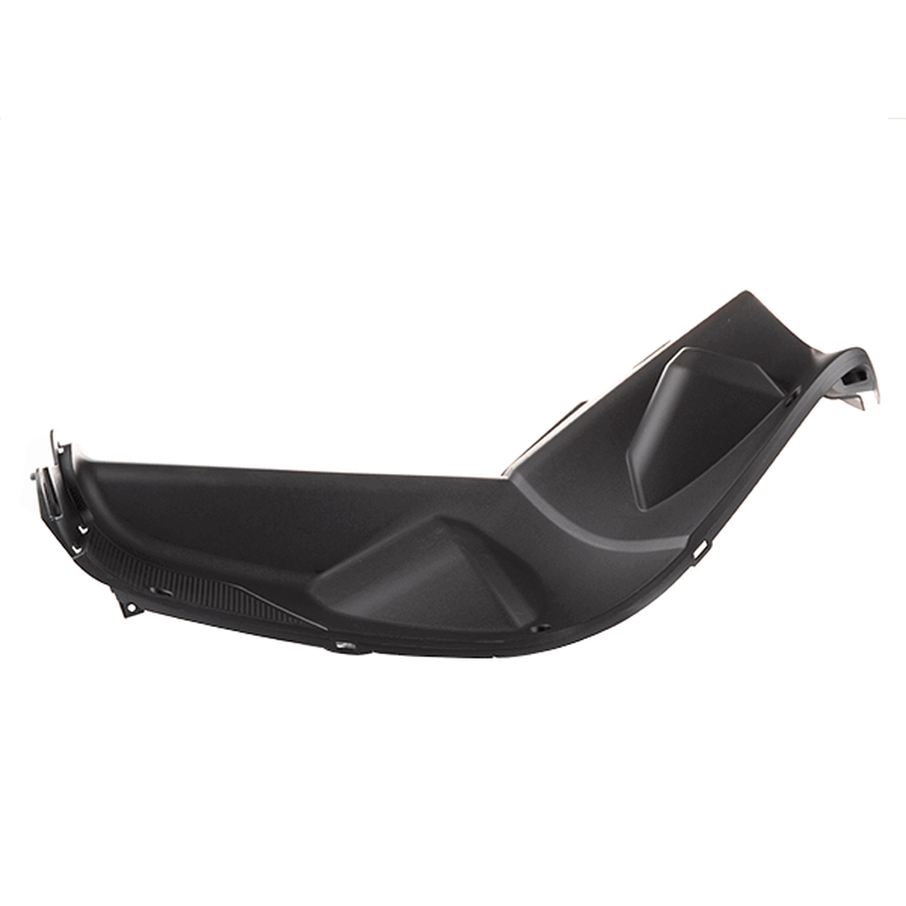 The footwell panel facing the knees on a motorcycle is a component designed to cover and protect the area around the rider's knees. Positioned in the lower part of the bike, it shields the rider's legs from debris, wind, and water, enhancing comfort during rides.