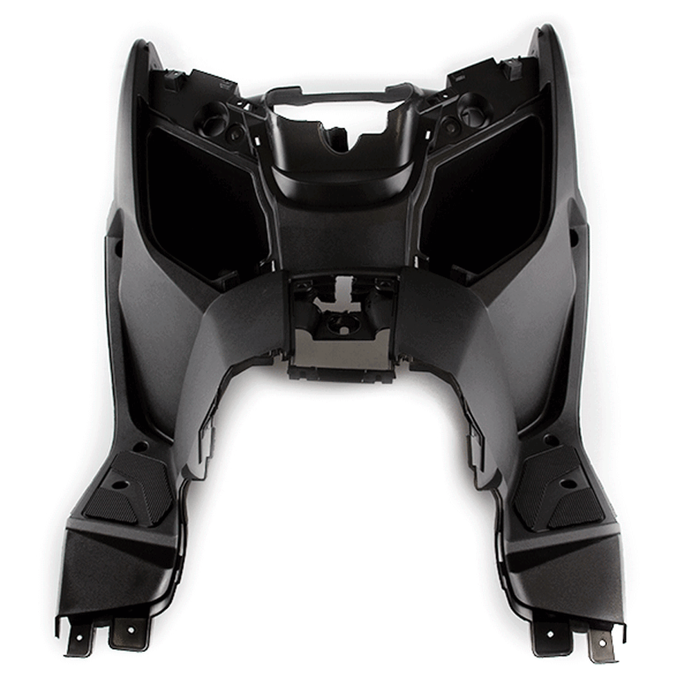 The footwell panel facing the knees on a motorcycle is a component designed to cover and protect the area around the rider's knees. Positioned in the lower part of the bike, it shields the rider's legs from debris, wind, and water, enhancing comfort during rides.