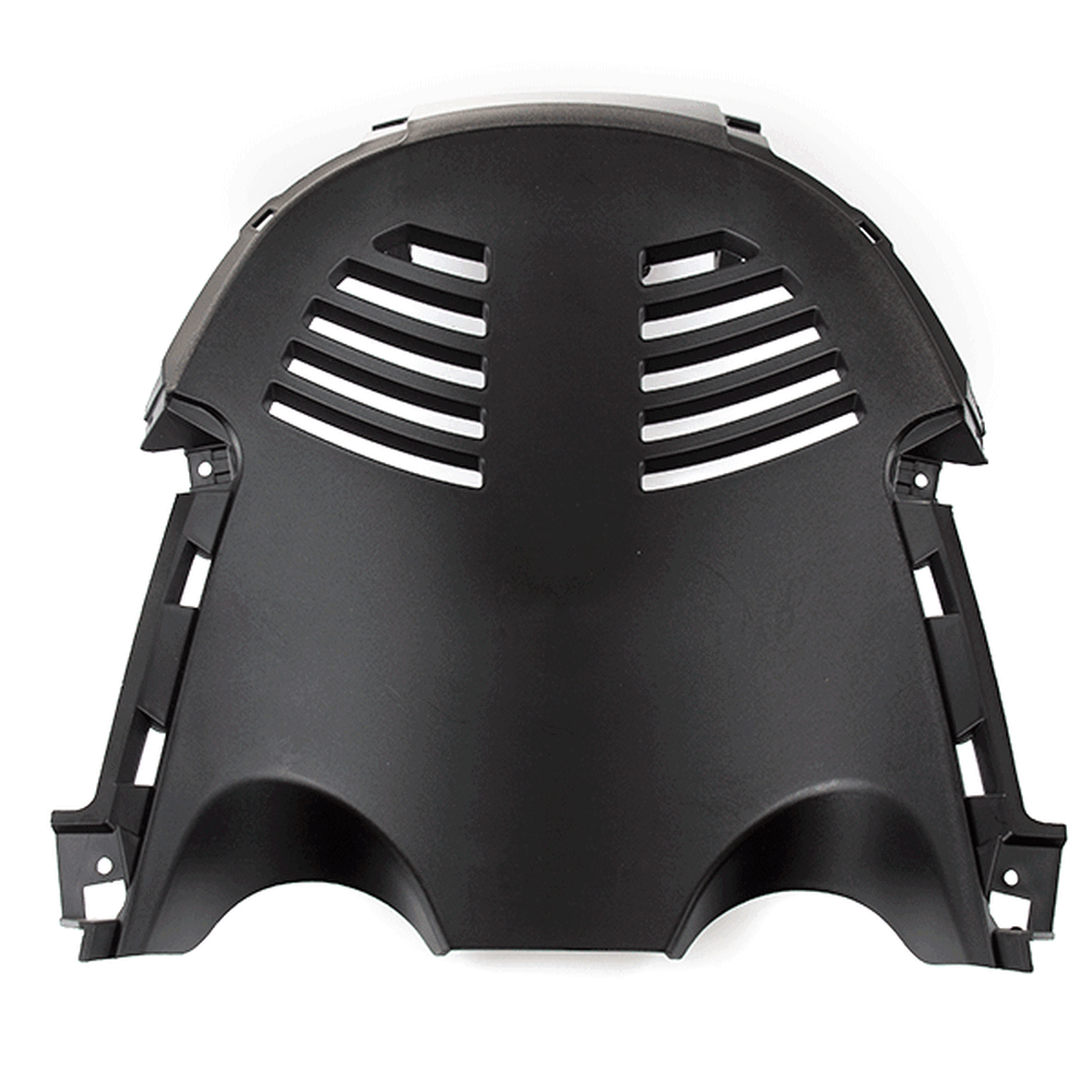 The footwell panel facing the knees on a motorcycle is a component designed to cover and protect the area around the rider's knees. Positioned in the lower part of the bike, it shields the rider's legs from debris, wind, and water, enhancing comfort during rides.