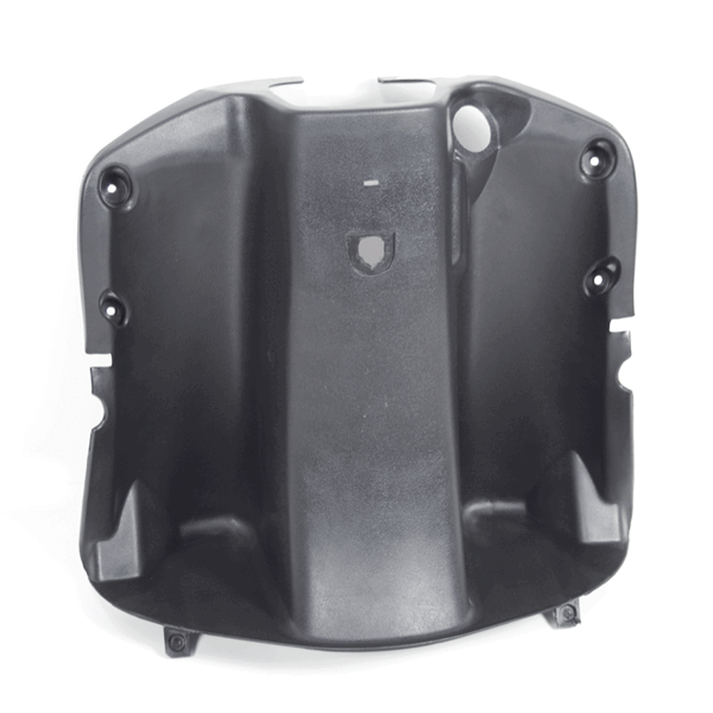 The footwell panel facing the knees on a motorcycle is a component designed to cover and protect the area around the rider's knees. Positioned in the lower part of the bike, it shields the rider's legs from debris, wind, and water, enhancing comfort during rides.