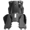 The footwell panel facing the knees on a motorcycle is a component designed to cover and protect the area around the rider's knees. Positioned in the lower part of the bike, it shields the rider's legs from debris, wind, and water, enhancing comfort during rides.