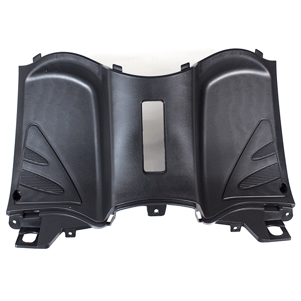 The footwell panel facing the knees on a motorcycle is a component designed to cover and protect the area around the rider's knees. Positioned in the lower part of the bike, it shields the rider's legs from debris, wind, and water, enhancing comfort during rides.