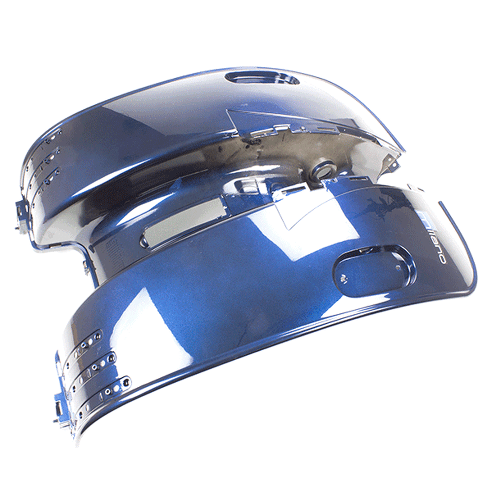 The footwell panel facing the knees on a motorcycle is a component designed to cover and protect the area around the rider's knees. Positioned in the lower part of the bike, it shields the rider's legs from debris, wind, and water, enhancing comfort during rides.