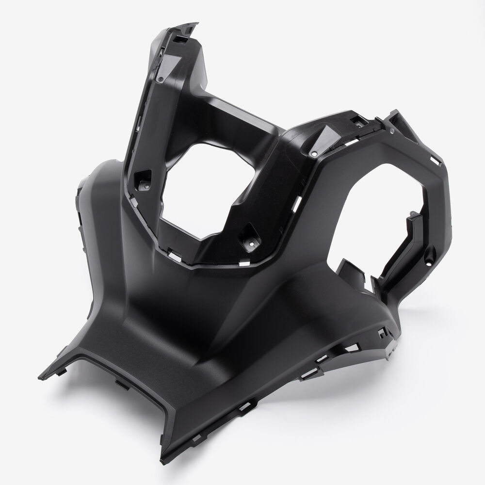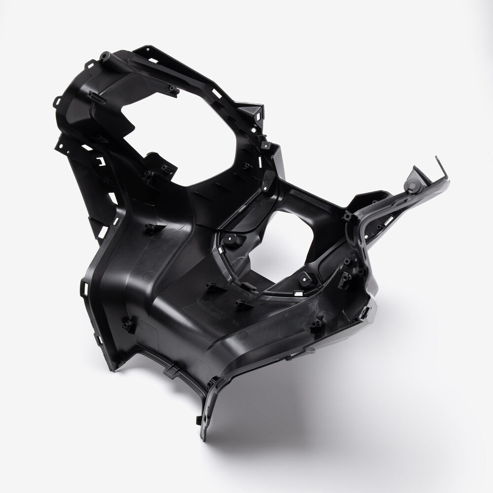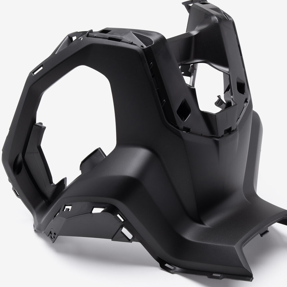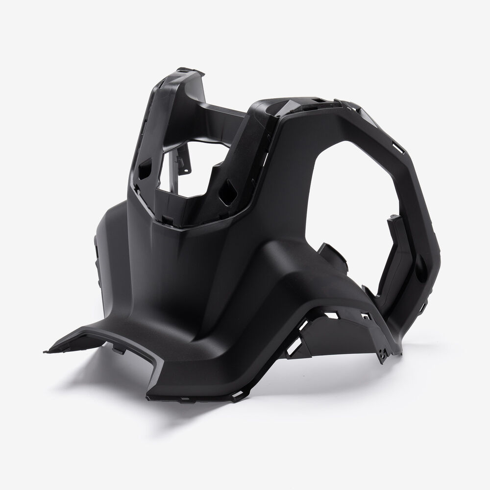 The footwell panel facing the knees on a motorcycle is a component designed to cover and protect the area around the rider's knees. Positioned in the lower part of the bike, it shields the rider's legs from debris, wind, and water, enhancing comfort during rides.