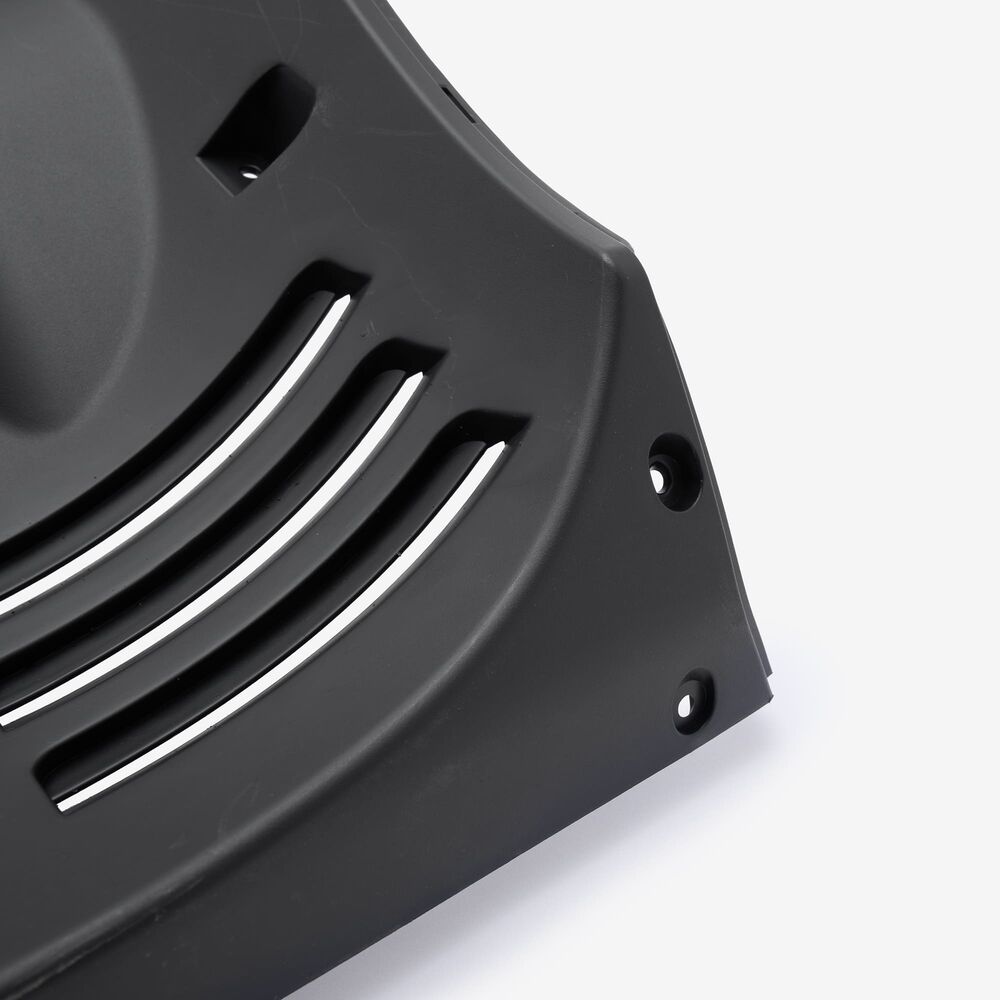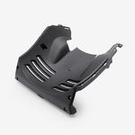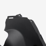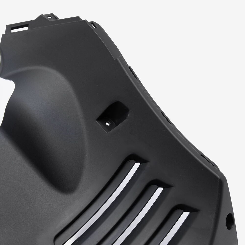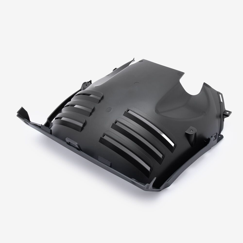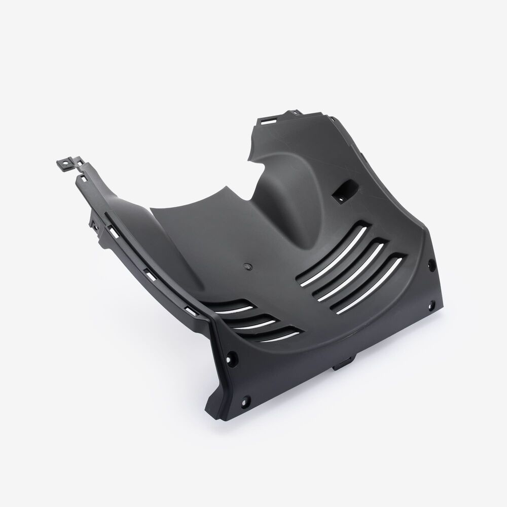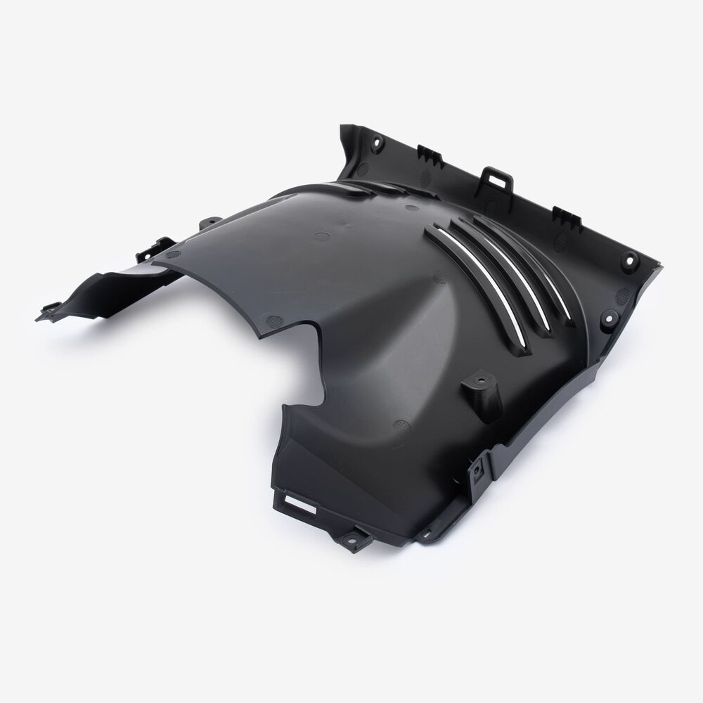 The footwell panel facing the knees on a motorcycle is a component designed to cover and protect the area around the rider's knees. Positioned in the lower part of the bike, it shields the rider's legs from debris, wind, and water, enhancing comfort during rides.