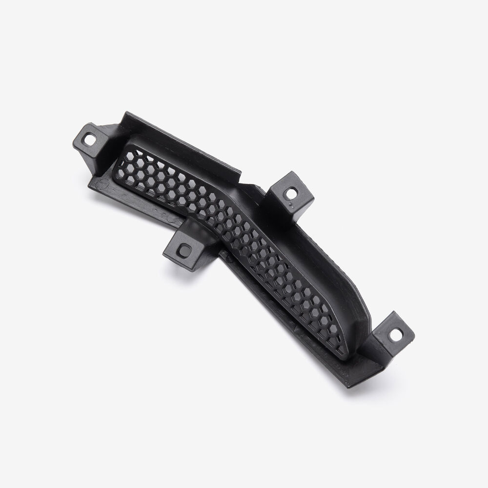 A decorative grill on a motorcycle is a stylistic component designed to enhance the bike's appearance. Often found on areas such as the radiator or air intake, it adds a unique, customized look while also providing a measure of protection to the underlying parts.