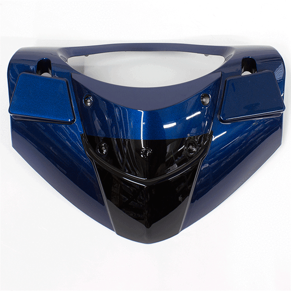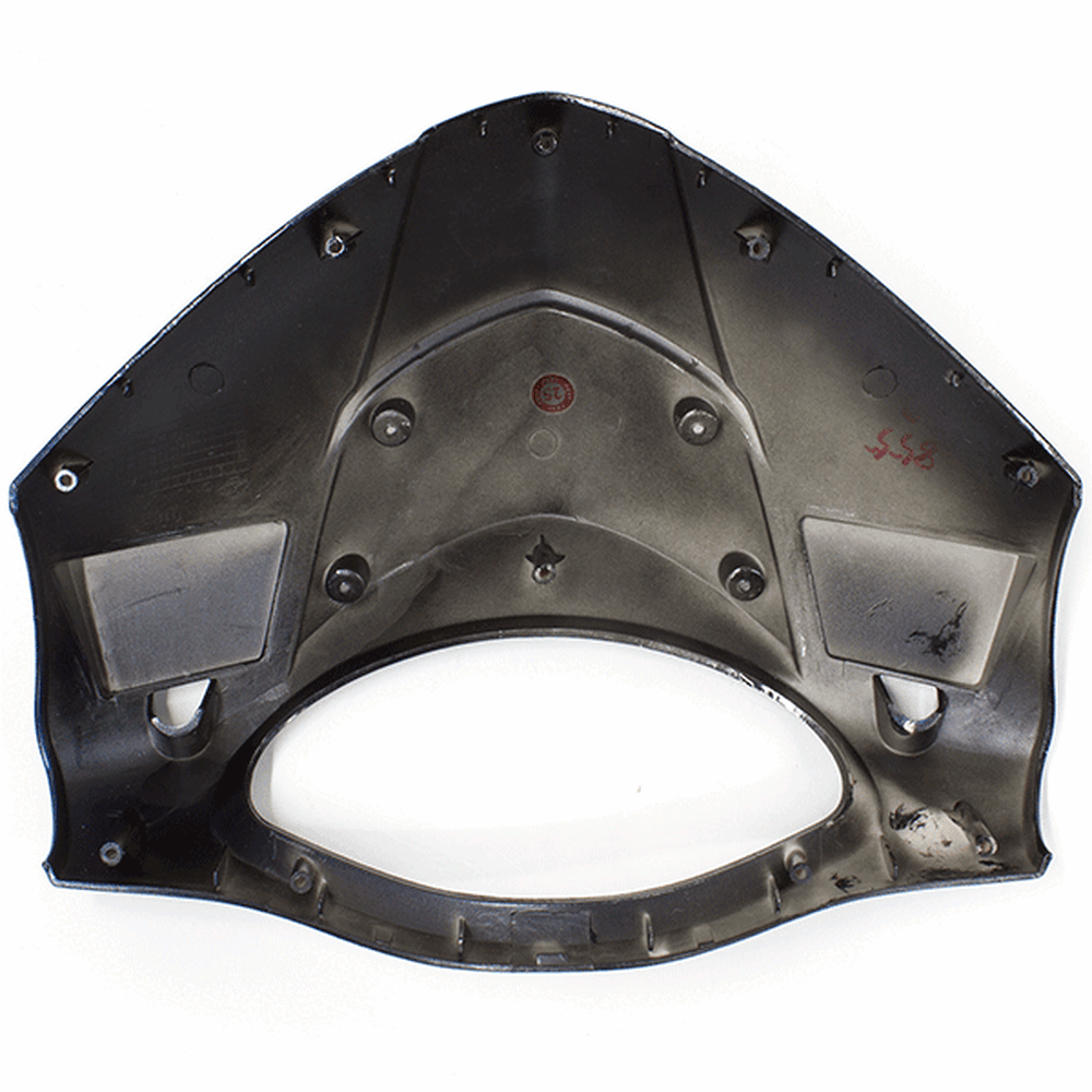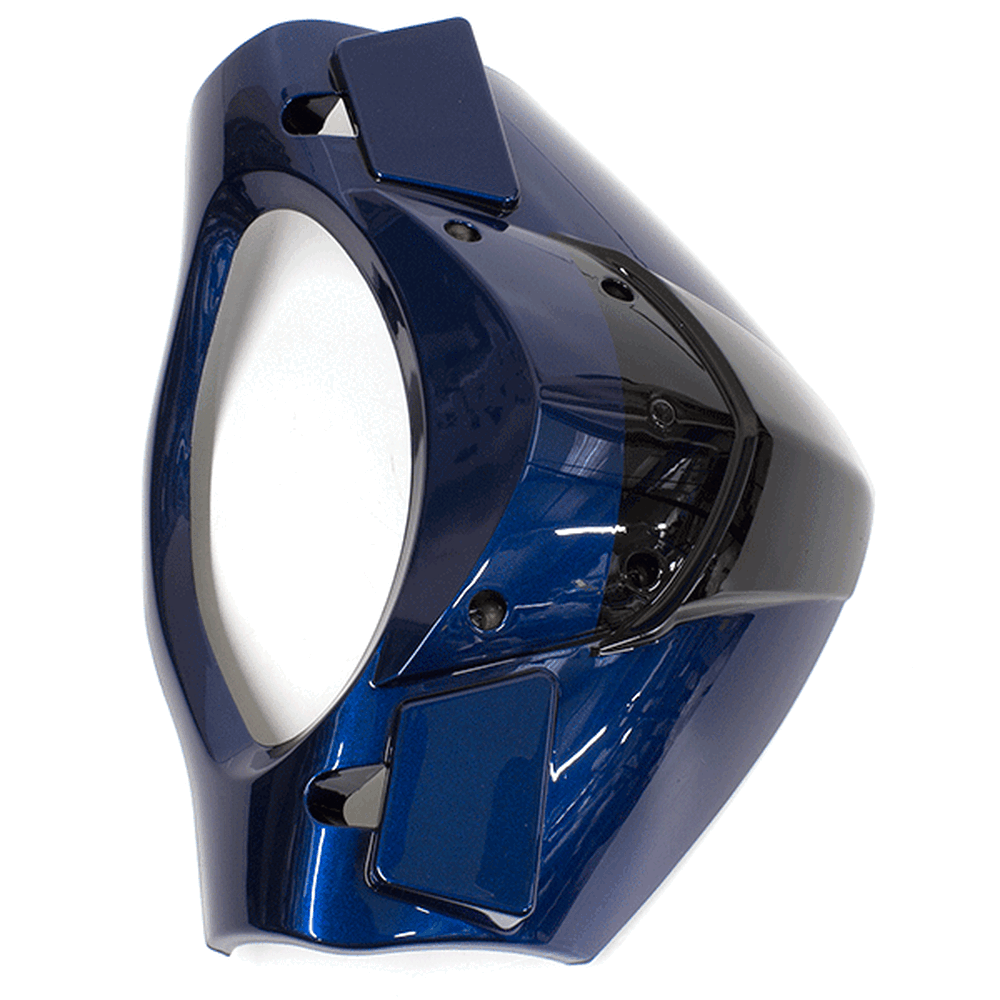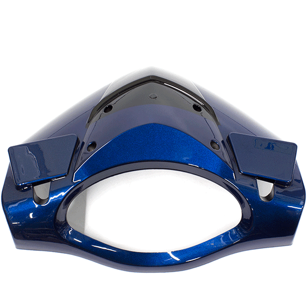 The handlebar fairing on a motorcycle is a protective and aerodynamic component mounted around the handlebars. It serves to shield the rider from wind, debris, and weather conditions, improving comfort during rides. The fairing also enhances the motorcycle's aerodynamic profile, which can contribute to better stability and performance at higher speeds. Additionally, it provides a finished, streamlined look to the front of the bike, complementing its overall design. Made from materials such as plastic or fiberglass, the handlebar fairing is designed to be durable and impact-resistant, ensuring both functionality and aesthetic appeal.