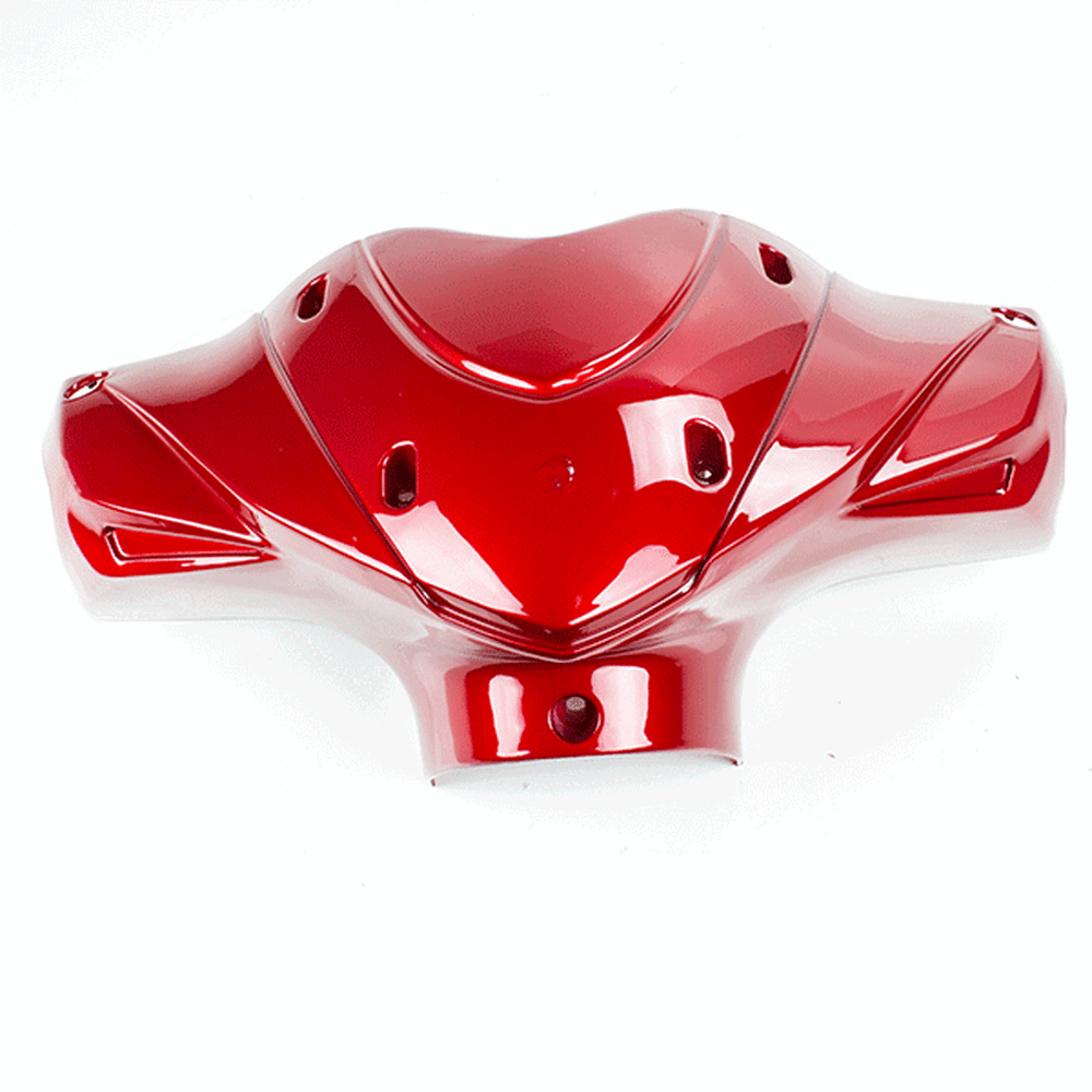 The handlebar fairing on a motorcycle is a protective and aerodynamic component mounted around the handlebars. It serves to shield the rider from wind, debris, and weather conditions, improving comfort during rides. The fairing also enhances the motorcycle's aerodynamic profile, which can contribute to better stability and performance at higher speeds. Additionally, it provides a finished, streamlined look to the front of the bike, complementing its overall design. Made from materials such as plastic or fiberglass, the handlebar fairing is designed to be durable and impact-resistant, ensuring both functionality and aesthetic appeal.