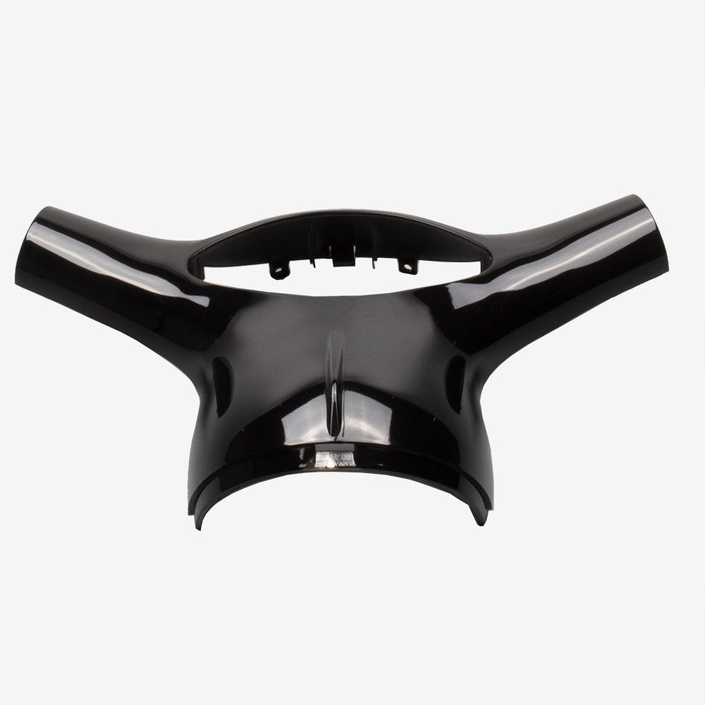 The handlebar fairing on a motorcycle is a protective and aerodynamic component mounted around the handlebars. It serves to shield the rider from wind, debris, and weather conditions, improving comfort during rides. The fairing also enhances the motorcycle's aerodynamic profile, which can contribute to better stability and performance at higher speeds. Additionally, it provides a finished, streamlined look to the front of the bike, complementing its overall design. Made from materials such as plastic or fiberglass, the handlebar fairing is designed to be durable and impact-resistant, ensuring both functionality and aesthetic appeal.
