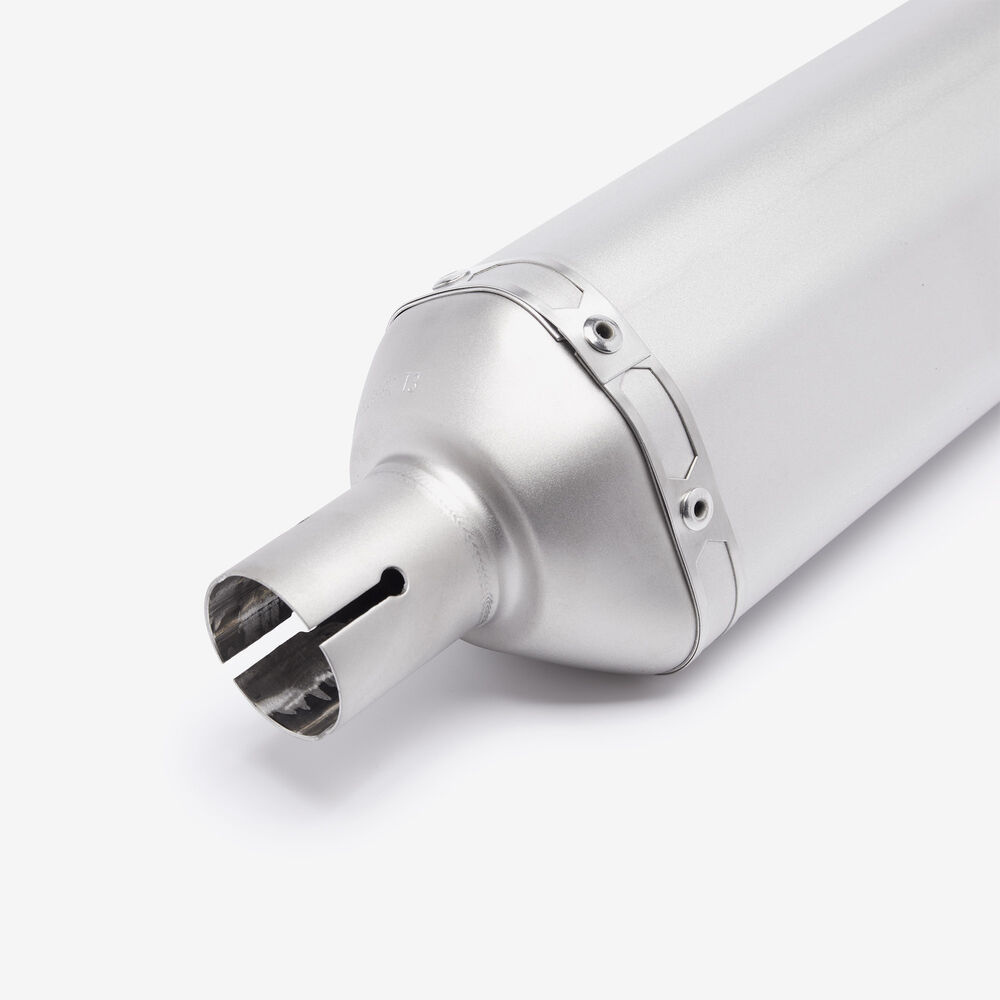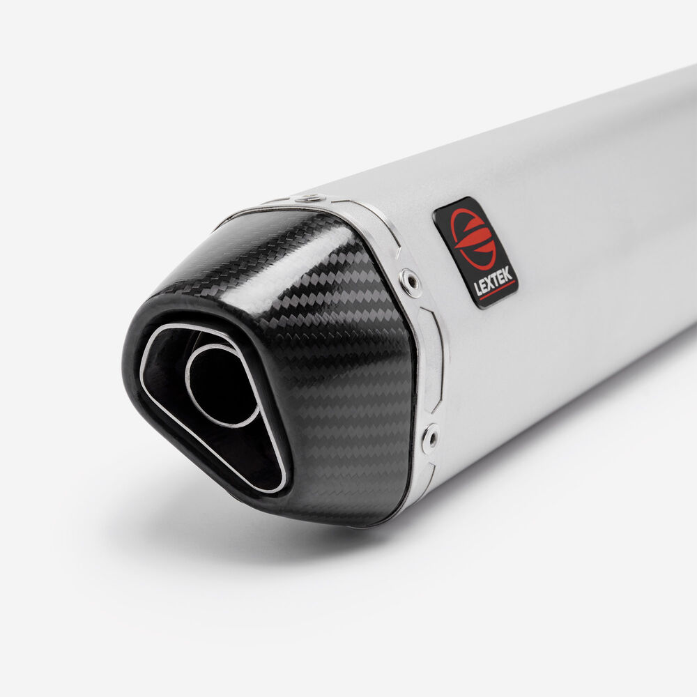 Matt finish stainless steel silencer with carbon fibre tail pipe and removable baffle.