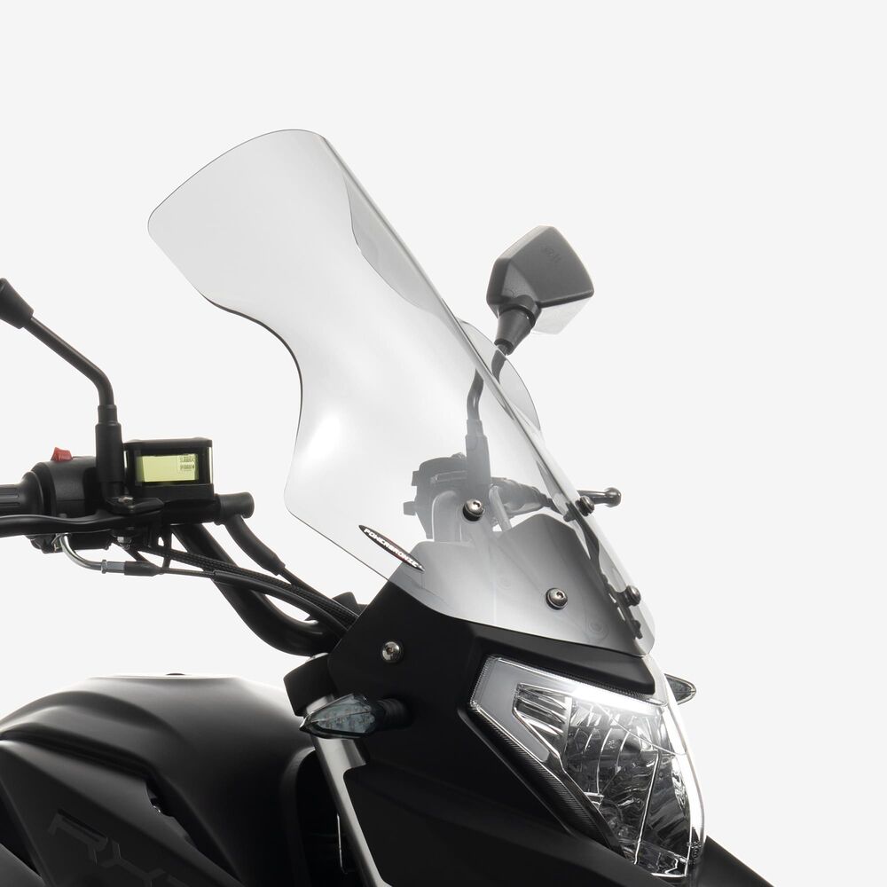 The visor or screen on a motorcycle is a transparent protective cover mounted on the front of the helmet or motorcycle to shield the rider from wind, debris, insects, and UV rays. It can be made from materials such as polycarbonate or acrylic and comes in various tints and finishes to enhance visibility and reduce glare. The visor is crucial for maintaining clear vision and rider comfort while also contributing to safety by protecting the rider’s face and eyes. Many visors are adjustable or replaceable, allowing for customization based on riding conditions and personal preference.