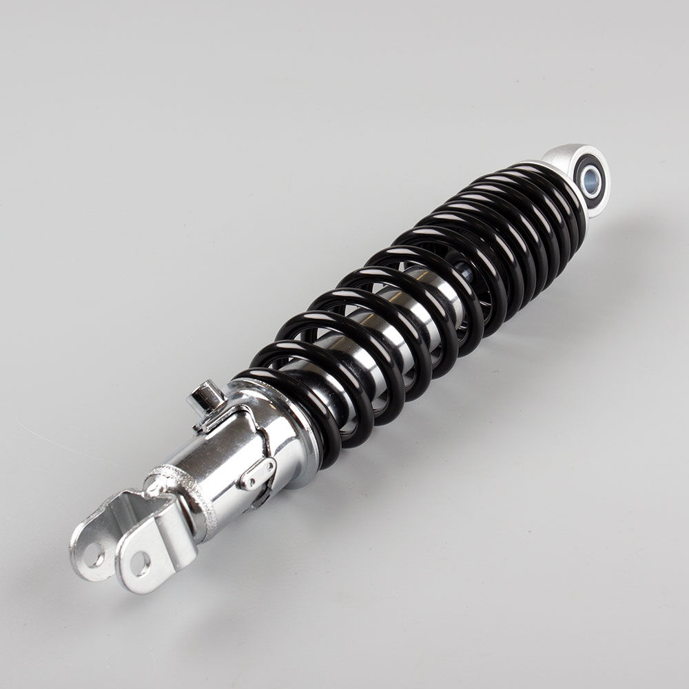 The shock absorber on a motorcycle is a key component of the suspension system designed to dampen and control the impact of road irregularities and vibrations. It absorbs and dissipates energy from the road or trail, providing a smoother and more stable ride by controlling the rate at which the motorcycle's suspension compresses and rebounds. Typically consisting of a piston, hydraulic fluid, and a spring, the shock absorber helps maintain wheel contact with the road, improves handling, and enhances rider comfort.