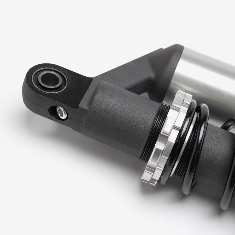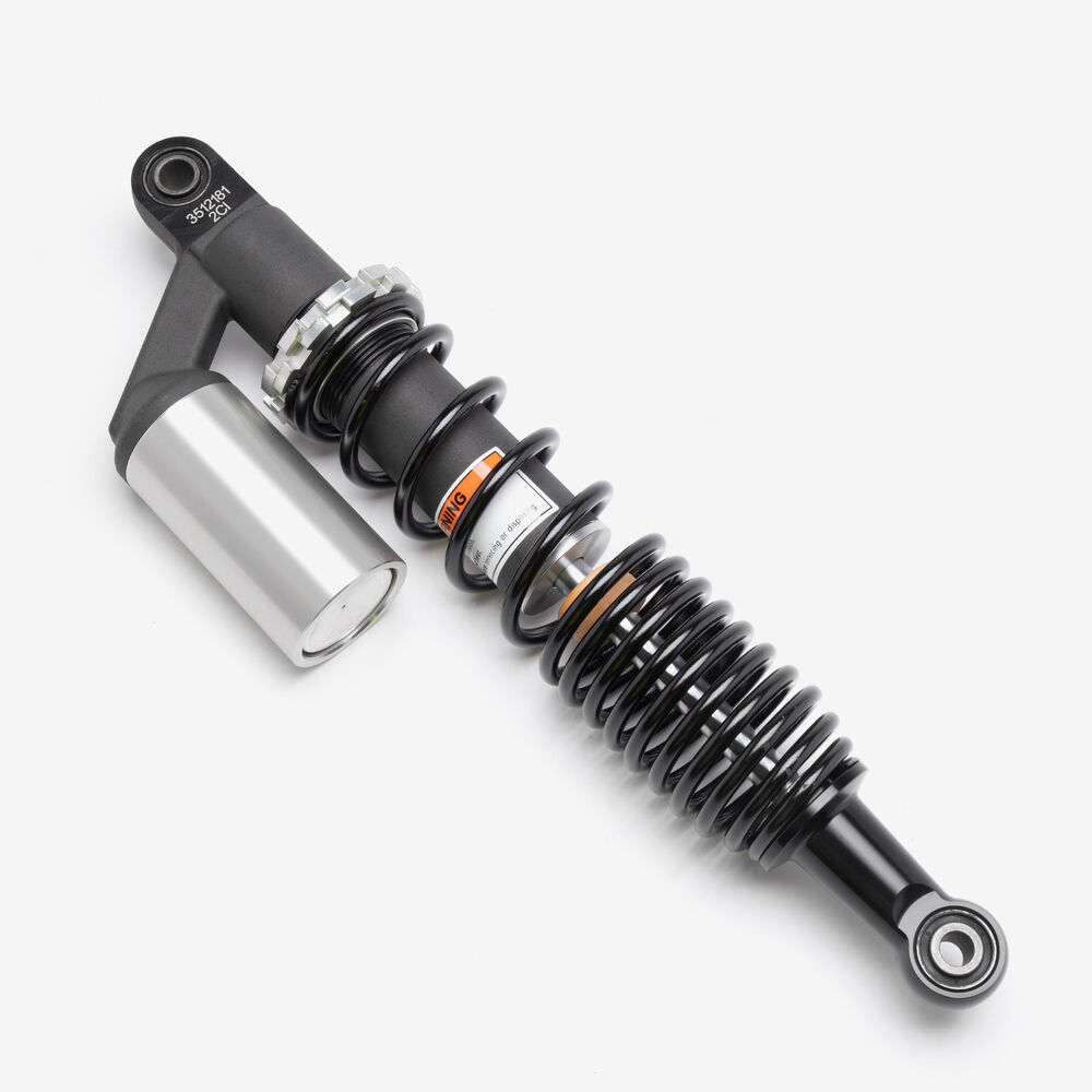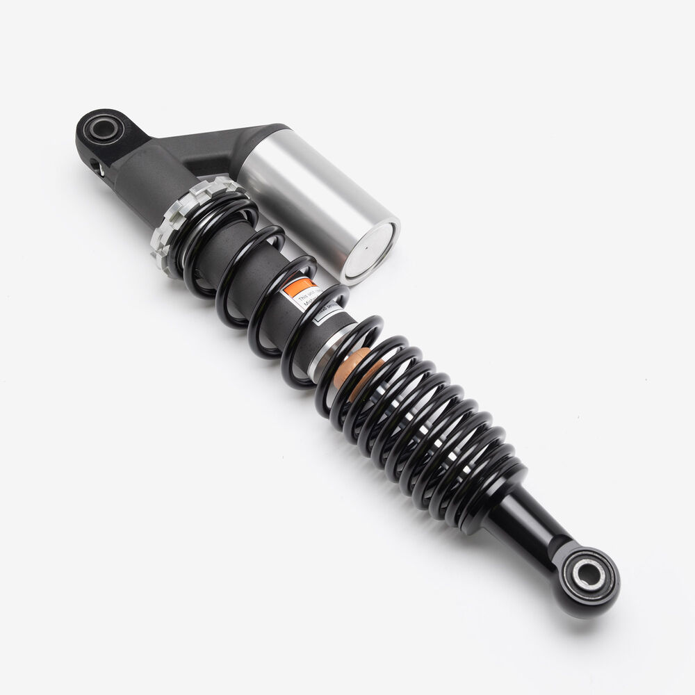 The shock absorber on a motorcycle is a key component of the suspension system designed to dampen and control the impact of road irregularities and vibrations. It absorbs and dissipates energy from the road or trail, providing a smoother and more stable ride by controlling the rate at which the motorcycle's suspension compresses and rebounds. Typically consisting of a piston, hydraulic fluid, and a spring, the shock absorber helps maintain wheel contact with the road, improves handling, and enhances rider comfort.