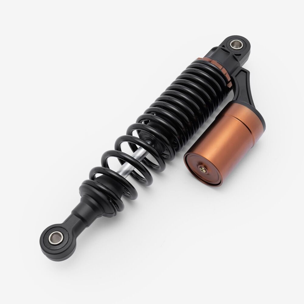 The shock absorber on a motorcycle is a key component of the suspension system designed to dampen and control the impact of road irregularities and vibrations. It absorbs and dissipates energy from the road or trail, providing a smoother and more stable ride by controlling the rate at which the motorcycle's suspension compresses and rebounds. Typically consisting of a piston, hydraulic fluid, and a spring, the shock absorber helps maintain wheel contact with the road, improves handling, and enhances rider comfort.