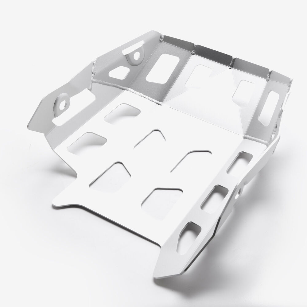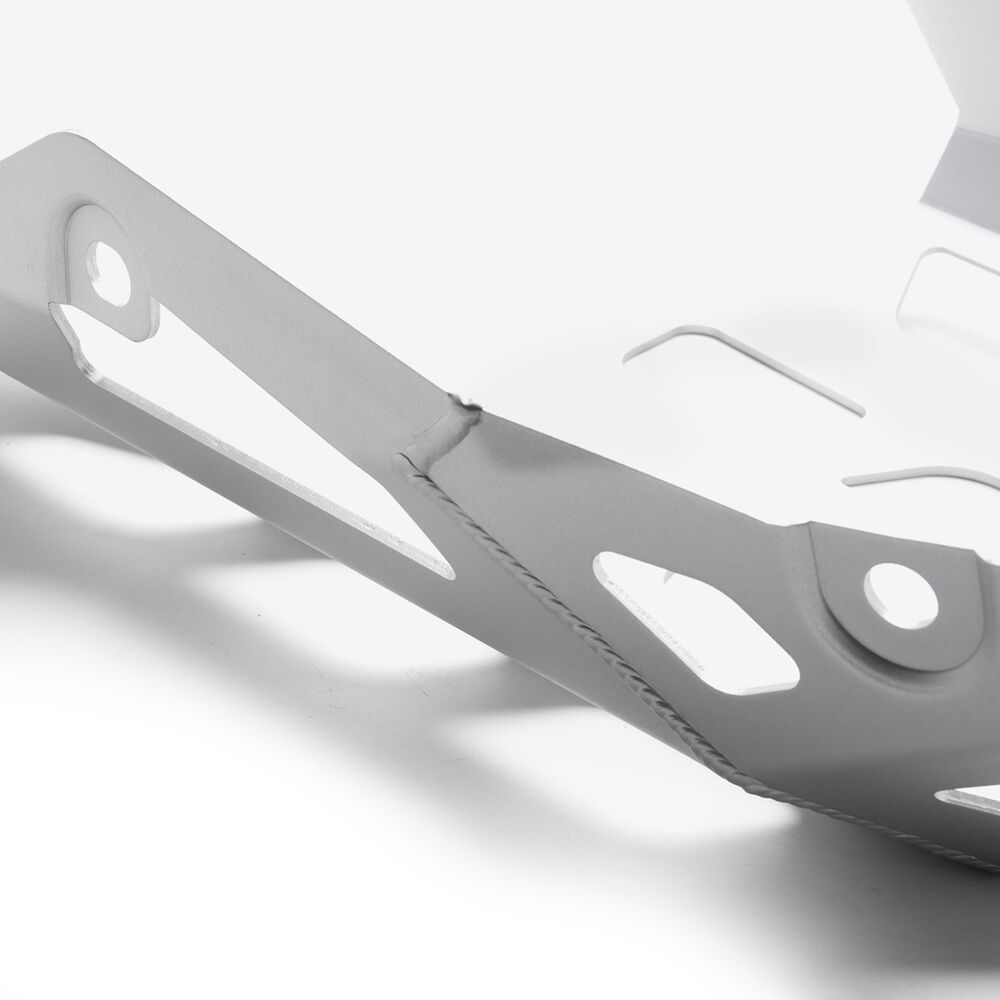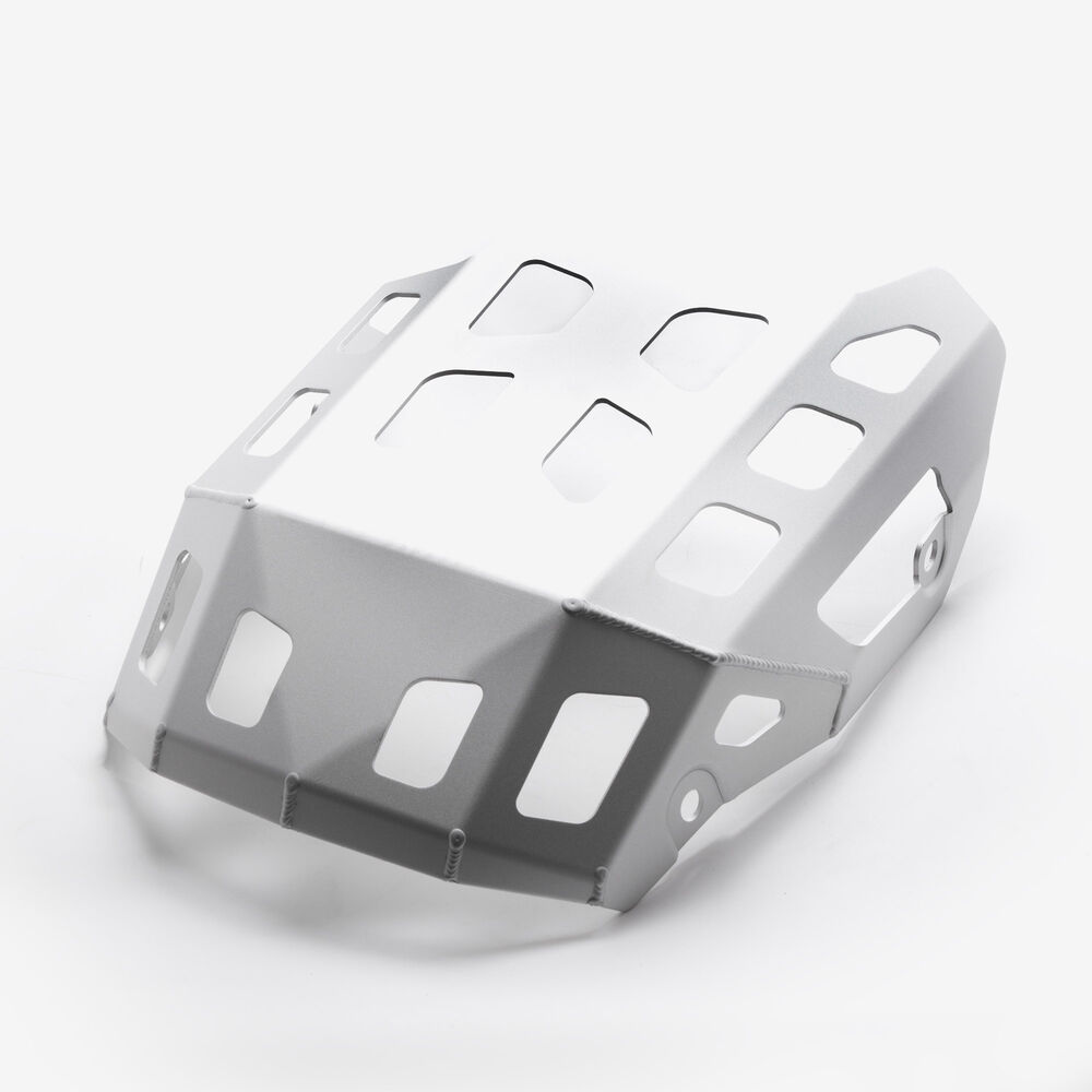 The sump guard, also known as an oil sump guard or skid plate, is a protective component mounted on the underside of a motorcycle. It shields the engine's oil sump and other vulnerable parts from damage caused by impacts, rocks, debris, or rough terrain. Typically made from durable materials such as aluminum, steel, or high-strength plastic, the sump guard helps prevent oil pan punctures and protects critical engine components during off-road riding or in harsh conditions.