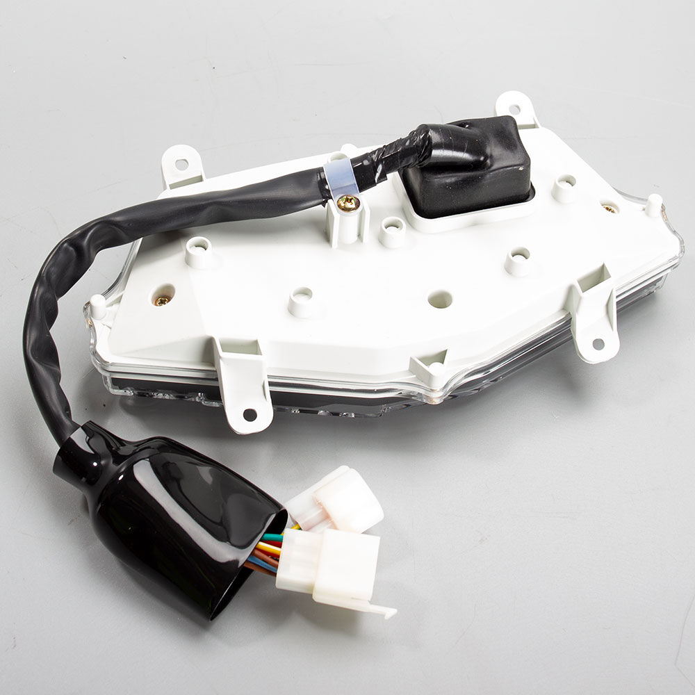 The speedo assembly, also known as the speedometer assembly, is the complete unit responsible for measuring and displaying the motorcycle's speed. It typically includes the speedometer gauge, which indicates the current speed, and may also encompass additional components such as the speedo drive, mounting brackets, and wiring or cables. The assembly converts rotational motion from the front wheel or transmission into a readable speed display. It is mounted on the motorcycle’s handlebars or dashboard, providing the rider with essential speed information for safe and efficient riding.