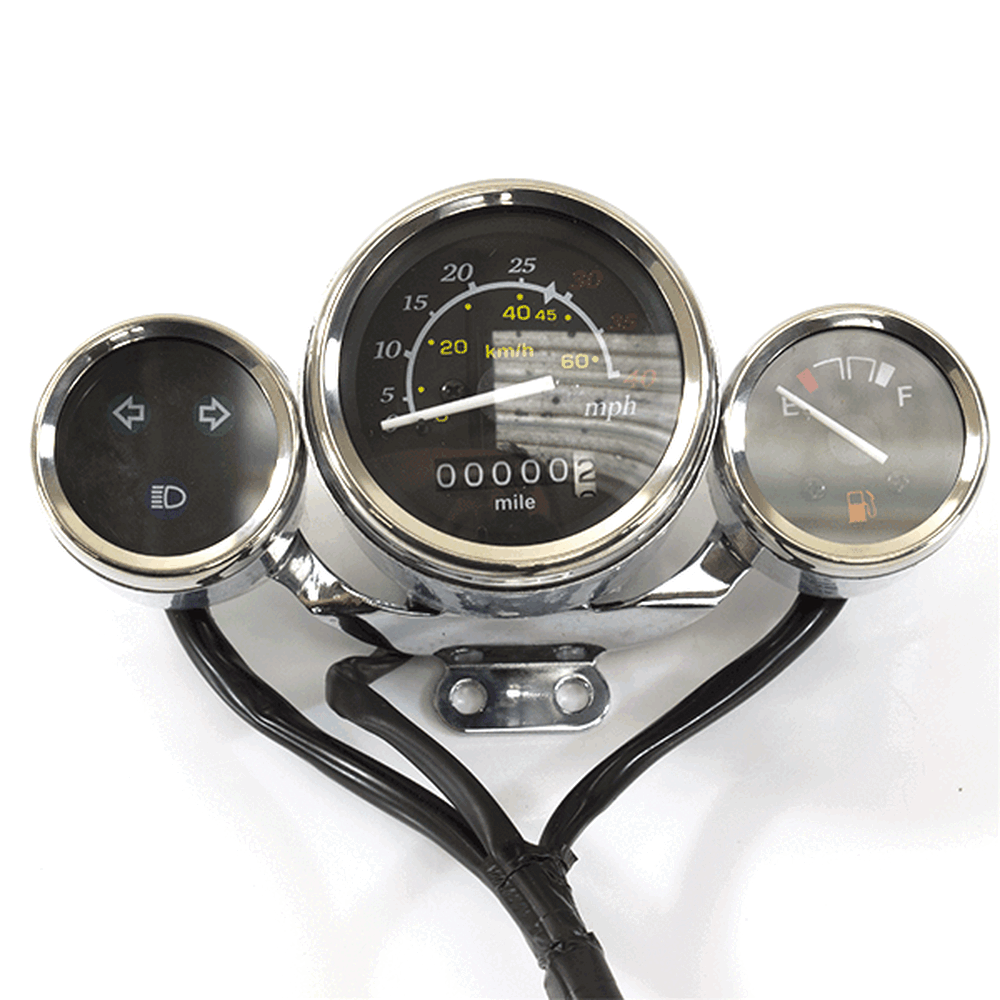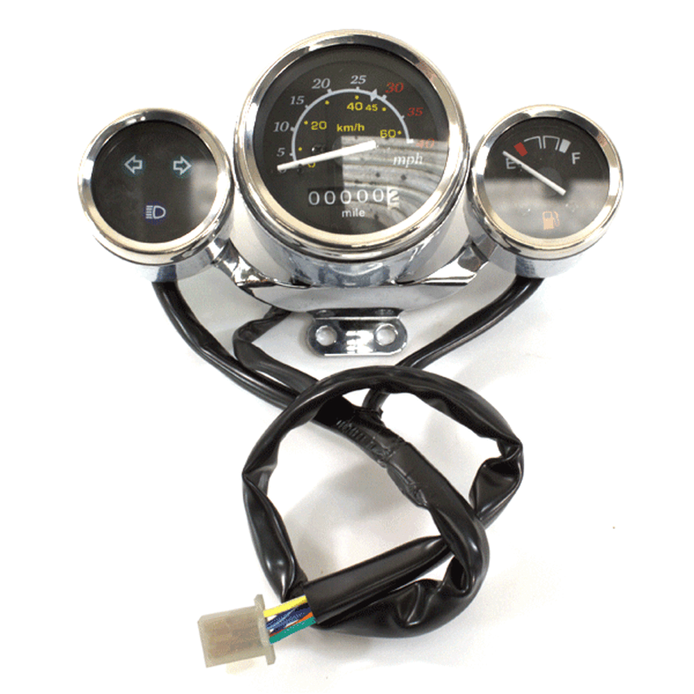 The speedo assembly, also known as the speedometer assembly, is the complete unit responsible for measuring and displaying the motorcycle's speed. It typically includes the speedometer gauge, which indicates the current speed, and may also encompass additional components such as the speedo drive, mounting brackets, and wiring or cables. The assembly converts rotational motion from the front wheel or transmission into a readable speed display. It is mounted on the motorcycle’s handlebars or dashboard, providing the rider with essential speed information for safe and efficient riding.