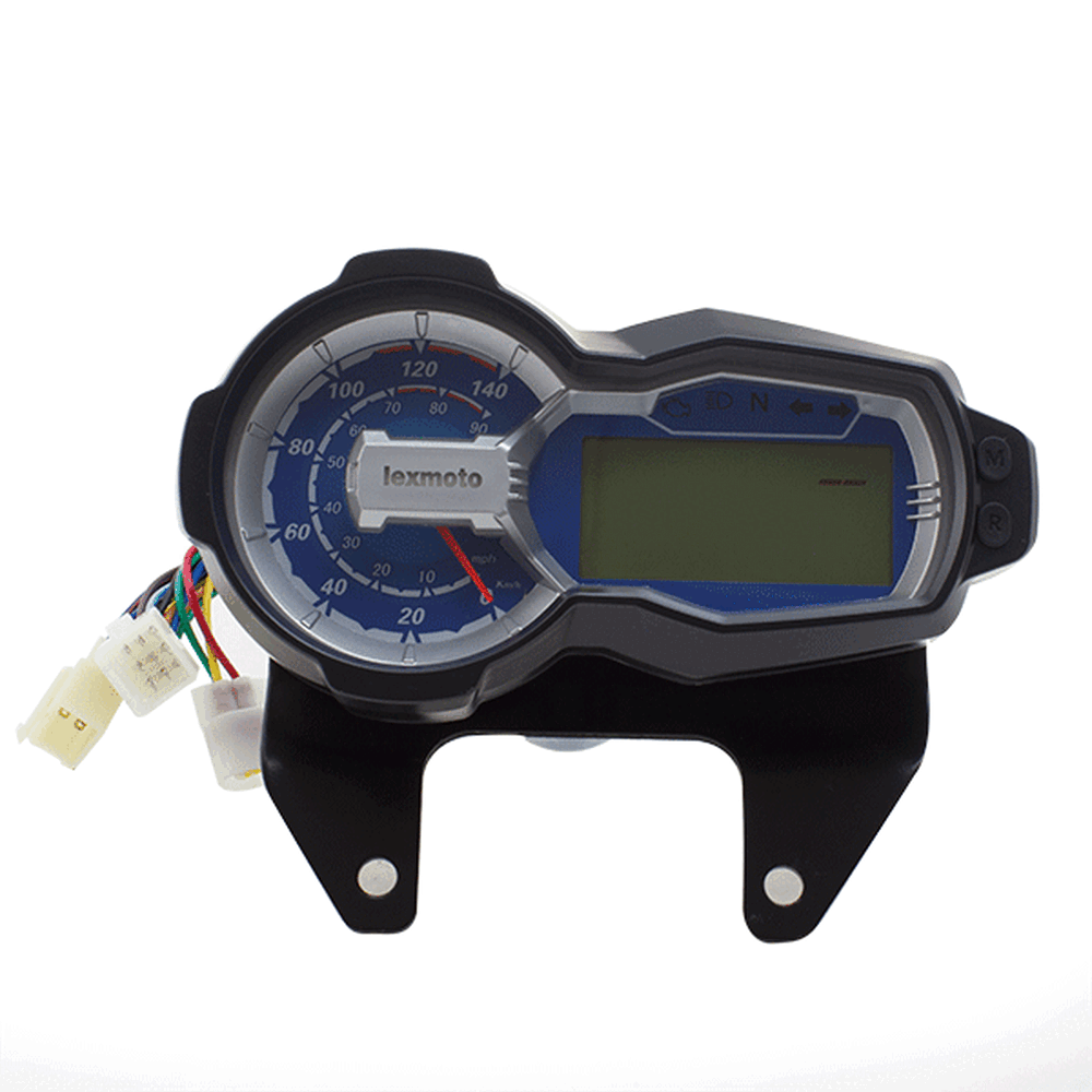 The speedo assembly, also known as the speedometer assembly, is the complete unit responsible for measuring and displaying the motorcycle's speed. It typically includes the speedometer gauge, which indicates the current speed, and may also encompass additional components such as the speedo drive, mounting brackets, and wiring or cables. The assembly converts rotational motion from the front wheel or transmission into a readable speed display. It is mounted on the motorcycle’s handlebars or dashboard, providing the rider with essential speed information for safe and efficient riding.