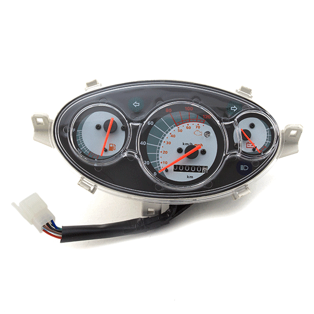 The speedo assembly, also known as the speedometer assembly, is the complete unit responsible for measuring and displaying the motorcycle's speed. It typically includes the speedometer gauge, which indicates the current speed, and may also encompass additional components such as the speedo drive, mounting brackets, and wiring or cables. The assembly converts rotational motion from the front wheel or transmission into a readable speed display. It is mounted on the motorcycle’s handlebars or dashboard, providing the rider with essential speed information for safe and efficient riding.