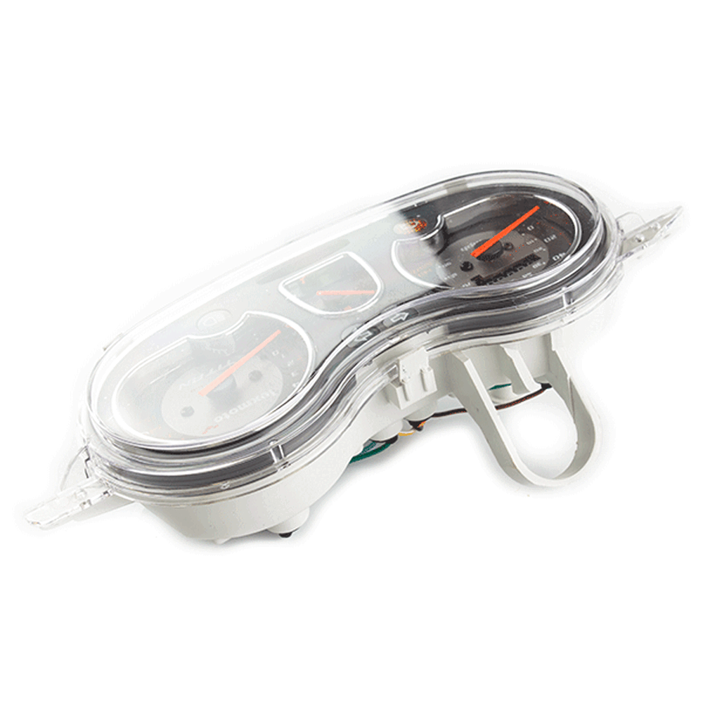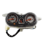 The speedo assembly, also known as the speedometer assembly, is the complete unit responsible for measuring and displaying the motorcycle's speed. It typically includes the speedometer gauge, which indicates the current speed, and may also encompass additional components such as the speedo drive, mounting brackets, and wiring or cables. The assembly converts rotational motion from the front wheel or transmission into a readable speed display. It is mounted on the motorcycle’s handlebars or dashboard, providing the rider with essential speed information for safe and efficient riding.
