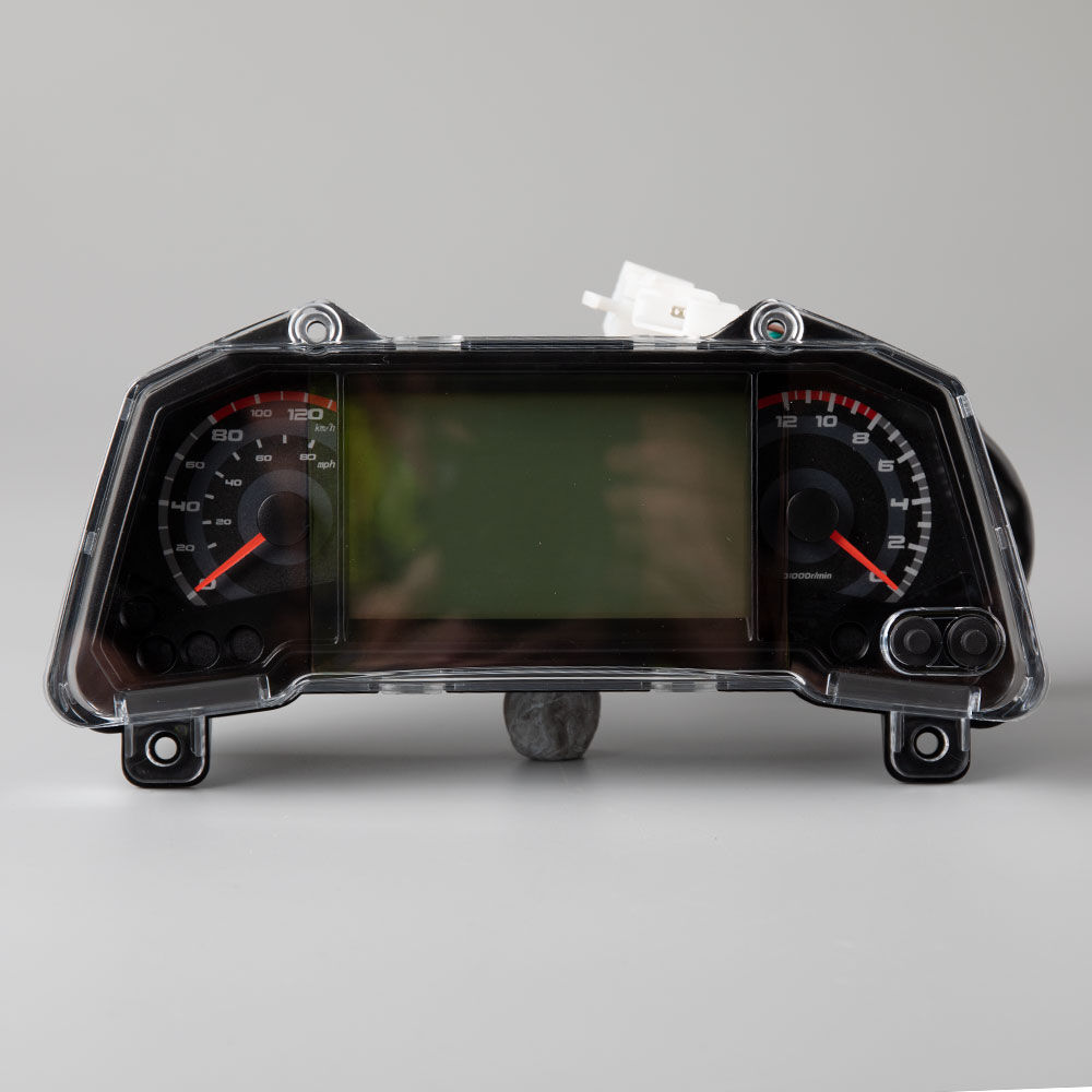 The speedo assembly, also known as the speedometer assembly, is the complete unit responsible for measuring and displaying the motorcycle's speed. It typically includes the speedometer gauge, which indicates the current speed, and may also encompass additional components such as the speedo drive, mounting brackets, and wiring or cables. The assembly converts rotational motion from the front wheel or transmission into a readable speed display. It is mounted on the motorcycle’s handlebars or dashboard, providing the rider with essential speed information for safe and efficient riding.