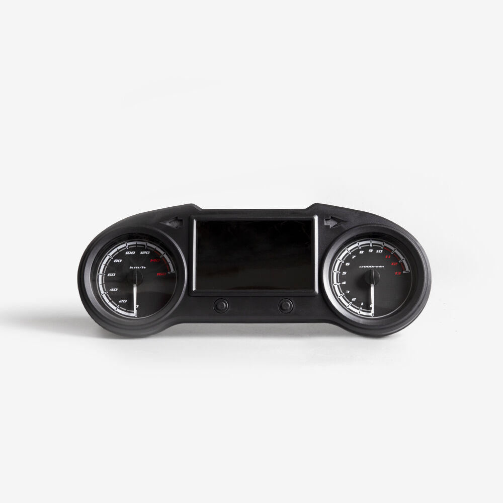The speedo assembly, also known as the speedometer assembly, is the complete unit responsible for measuring and displaying the motorcycle's speed. It typically includes the speedometer gauge, which indicates the current speed, and may also encompass additional components such as the speedo drive, mounting brackets, and wiring or cables. The assembly converts rotational motion from the front wheel or transmission into a readable speed display. It is mounted on the motorcycle’s handlebars or dashboard, providing the rider with essential speed information for safe and efficient riding.
