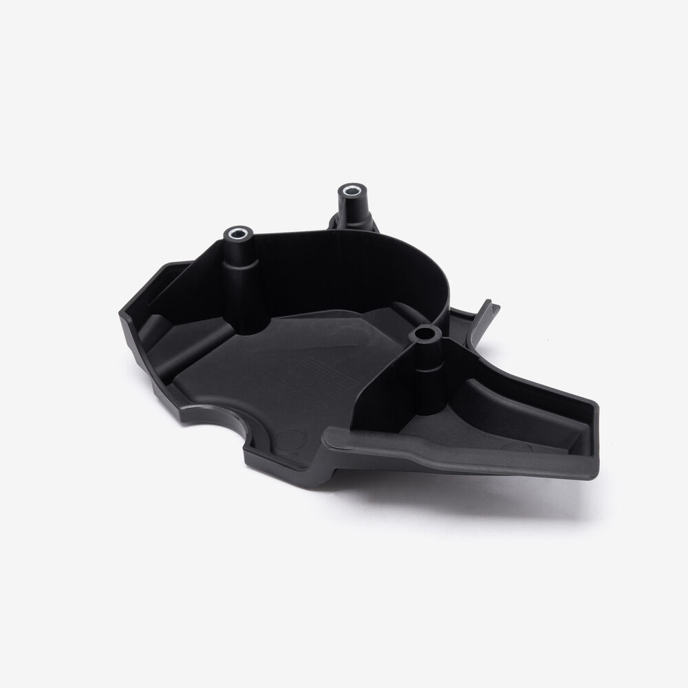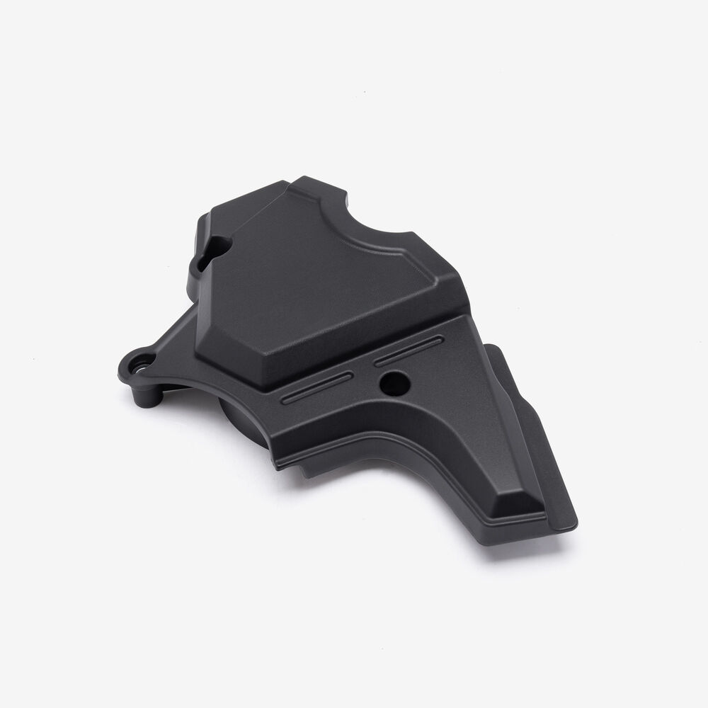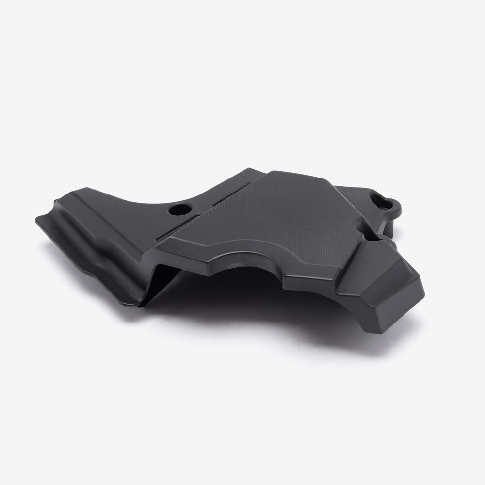 The front sprocket cover is a protective component that shields the front sprocket and chain from debris, dirt, and water. Typically made from durable materials such as plastic or metal, it is mounted over the front sprocket and often includes provisions for securing it to the motorcycle's frame or engine. The cover helps to prevent contamination of the sprocket and chain, reducing wear and extending their lifespan. Additionally, it can enhance safety by preventing accidental contact with the rotating sprocket.