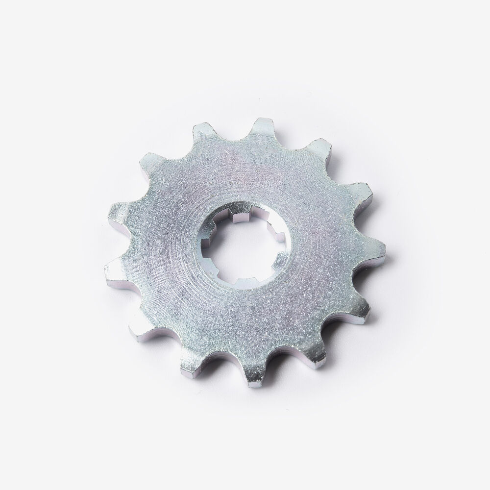 The front sprocket, also known as the countershaft sprocket, is a key component in a motorcycle's drivetrain. Located at the output shaft of the engine or transmission, it engages with the motorcycle's chain to transmit power from the engine to the rear wheel. The front sprocket works in conjunction with the rear sprocket and chain to control the motorcycle’s gearing, affecting acceleration, top speed, and overall performance. Its size and number of teeth influence the bike’s torque and speed characteristics.
