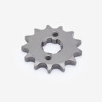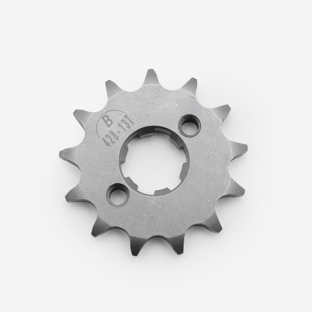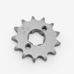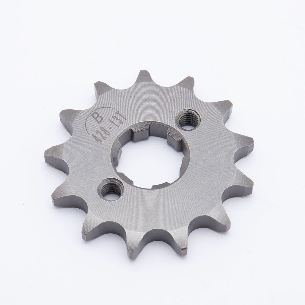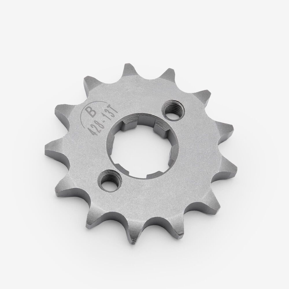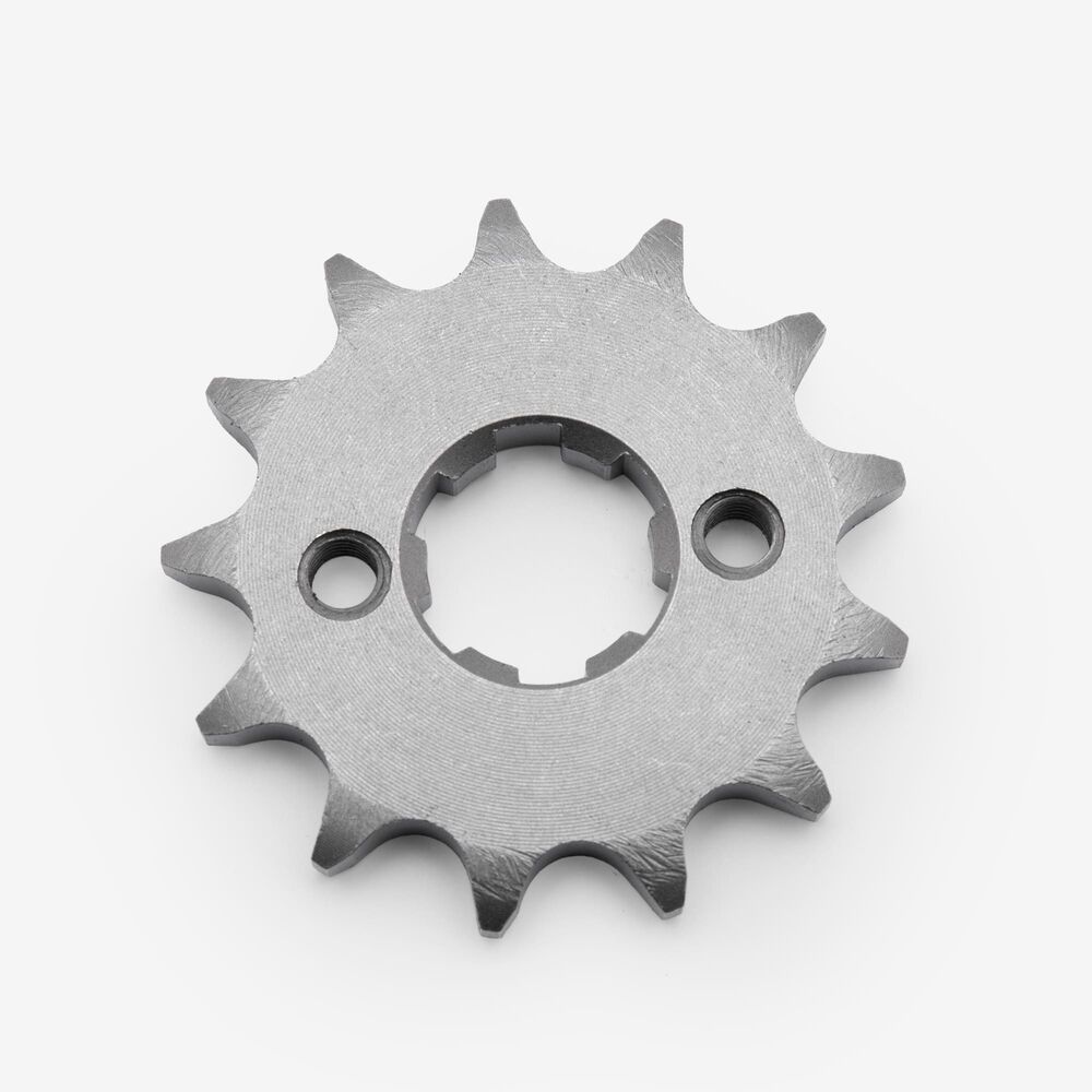 The front sprocket, also known as the countershaft sprocket, is a key component in a motorcycle's drivetrain. Located at the output shaft of the engine or transmission, it engages with the motorcycle's chain to transmit power from the engine to the rear wheel. The front sprocket works in conjunction with the rear sprocket and chain to control the motorcycle’s gearing, affecting acceleration, top speed, and overall performance. Its size and number of teeth influence the bike’s torque and speed characteristics.