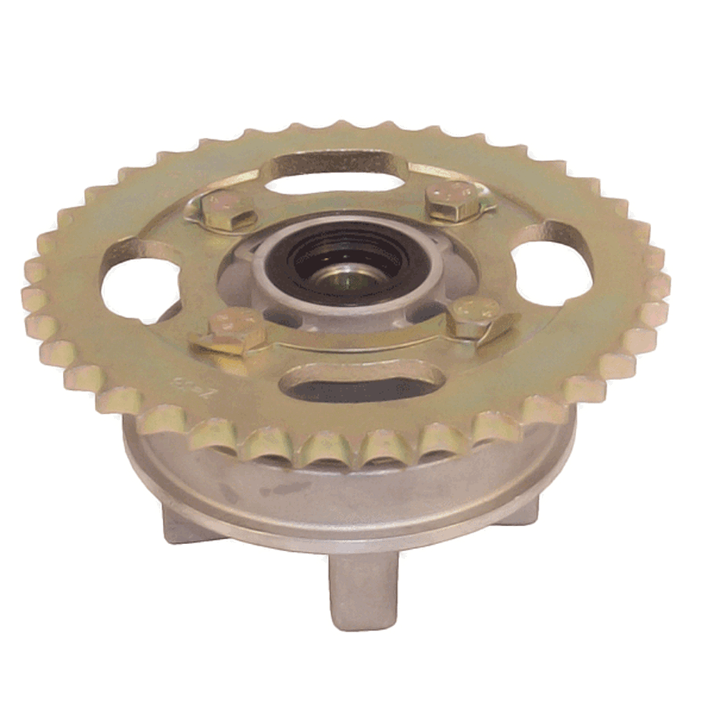 The sprocket hub is a central component that connects the sprocket to the motorcycle's wheel or drive assembly. It is typically a metal disc or plate with a central mounting area that aligns with the wheel's hub or drive shaft. The sprocket hub ensures proper alignment and stability of the sprocket, which is crucial for efficient power transfer from the engine to the rear wheel. It may include features for mounting bolts or securing mechanisms and is designed to withstand the forces and vibrations experienced during riding.