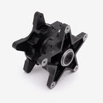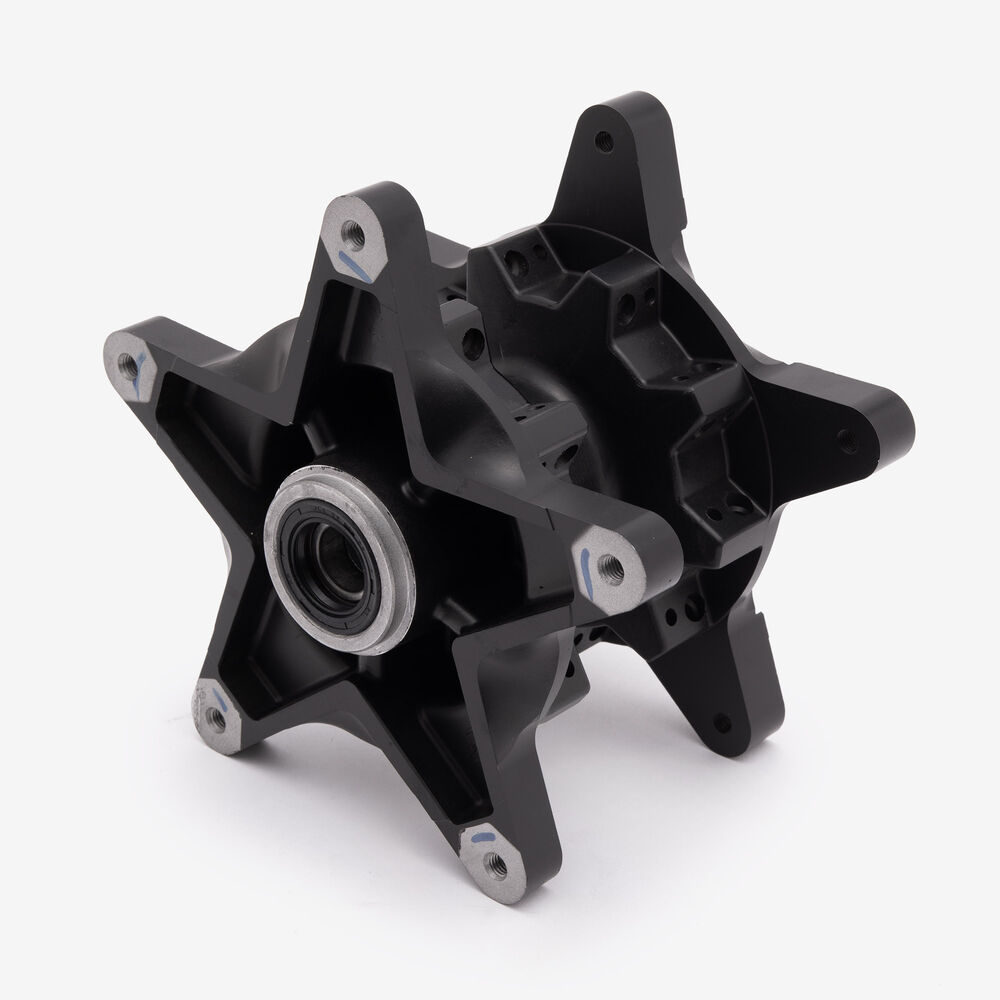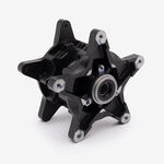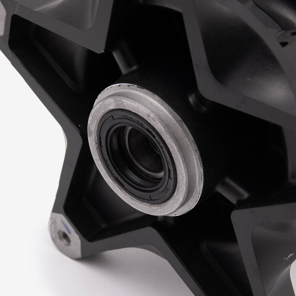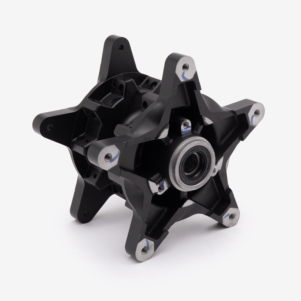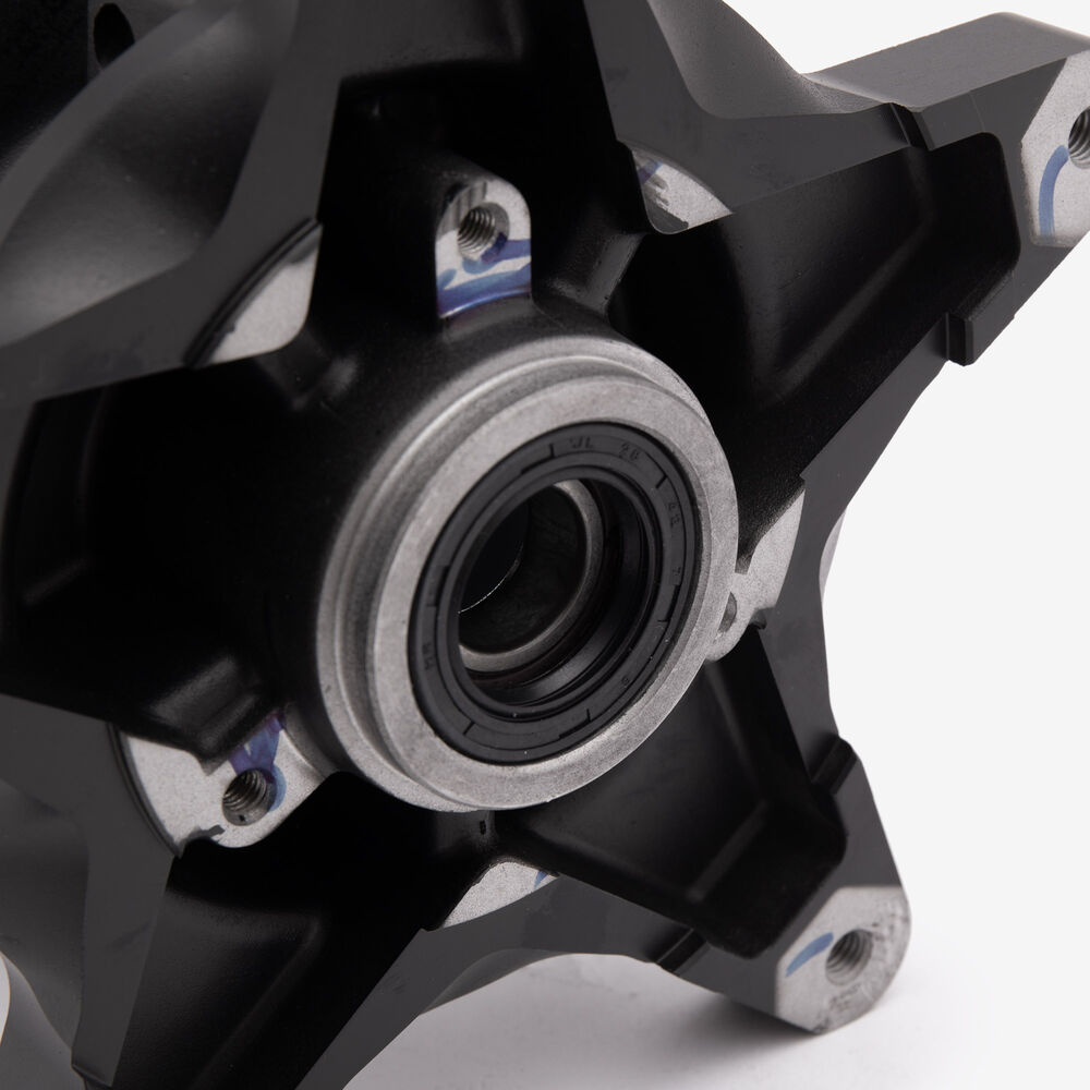 The sprocket hub is a central component that connects the sprocket to the motorcycle's wheel or drive assembly. It is typically a metal disc or plate with a central mounting area that aligns with the wheel's hub or drive shaft. The sprocket hub ensures proper alignment and stability of the sprocket, which is crucial for efficient power transfer from the engine to the rear wheel. It may include features for mounting bolts or securing mechanisms and is designed to withstand the forces and vibrations experienced during riding.