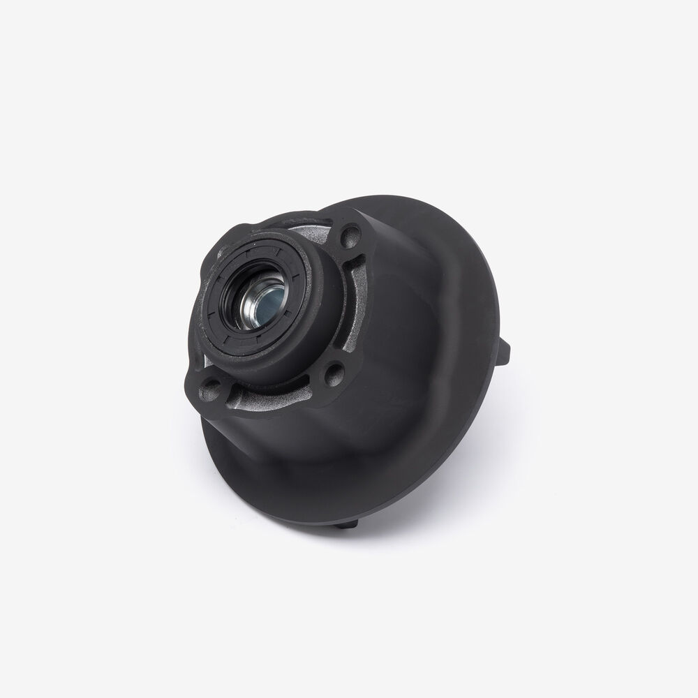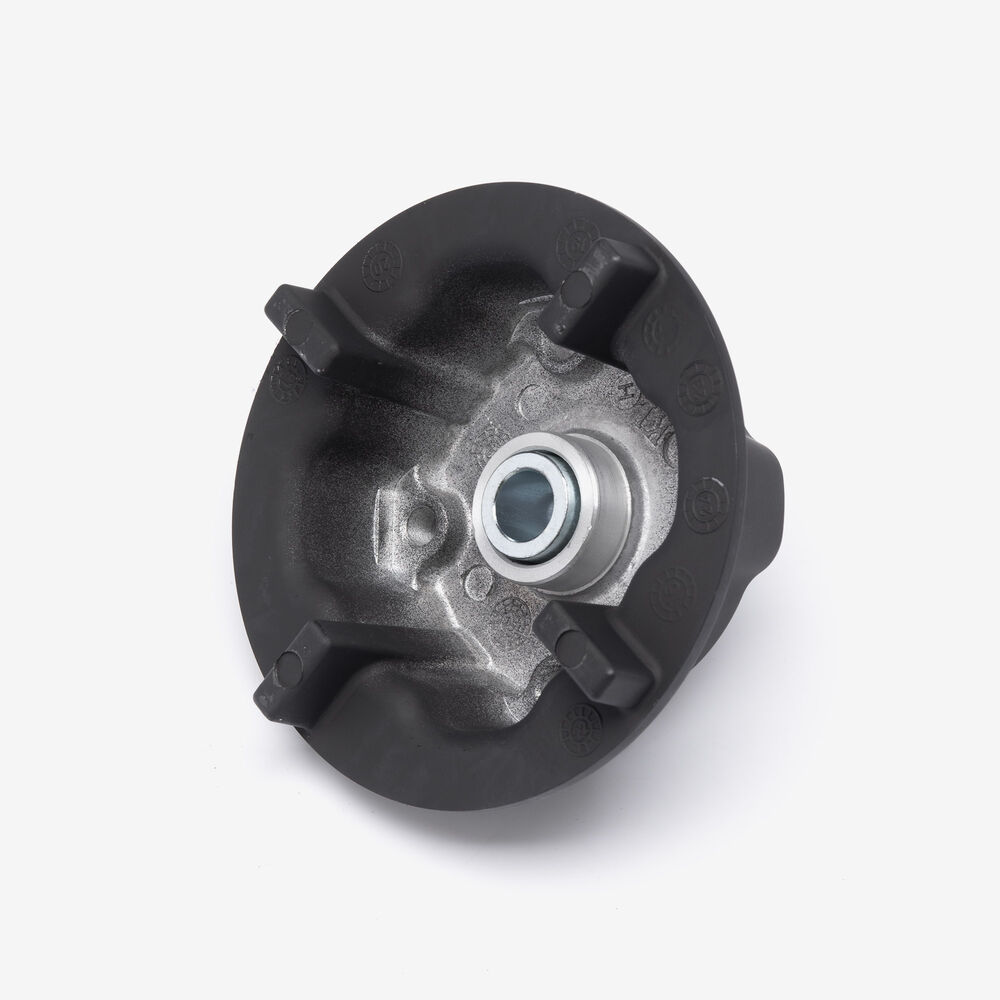 The sprocket hub is a central component that connects the sprocket to the motorcycle's wheel or drive assembly. It is typically a metal disc or plate with a central mounting area that aligns with the wheel's hub or drive shaft. The sprocket hub ensures proper alignment and stability of the sprocket, which is crucial for efficient power transfer from the engine to the rear wheel. It may include features for mounting bolts or securing mechanisms and is designed to withstand the forces and vibrations experienced during riding.