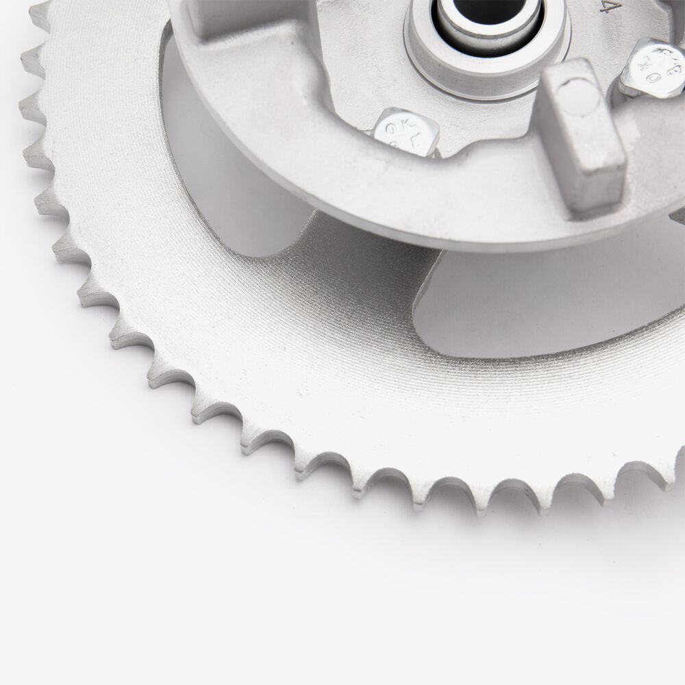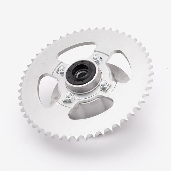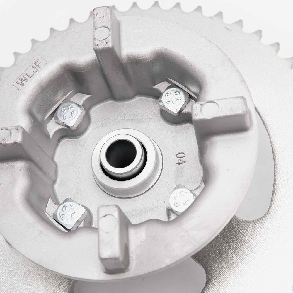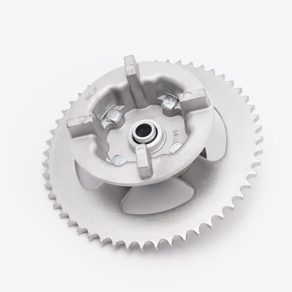 The sprocket hub is a central component that connects the sprocket to the motorcycle's wheel or drive assembly. It is typically a metal disc or plate with a central mounting area that aligns with the wheel's hub or drive shaft. The sprocket hub ensures proper alignment and stability of the sprocket, which is crucial for efficient power transfer from the engine to the rear wheel. It may include features for mounting bolts or securing mechanisms and is designed to withstand the forces and vibrations experienced during riding.