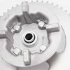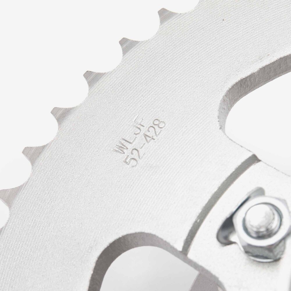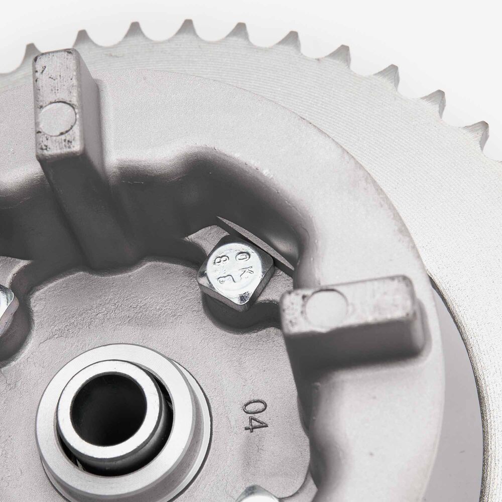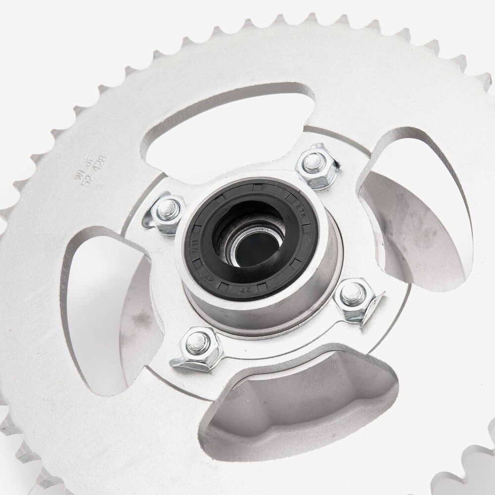 The sprocket hub is a central component that connects the sprocket to the motorcycle's wheel or drive assembly. It is typically a metal disc or plate with a central mounting area that aligns with the wheel's hub or drive shaft. The sprocket hub ensures proper alignment and stability of the sprocket, which is crucial for efficient power transfer from the engine to the rear wheel. It may include features for mounting bolts or securing mechanisms and is designed to withstand the forces and vibrations experienced during riding.