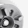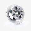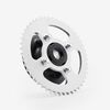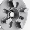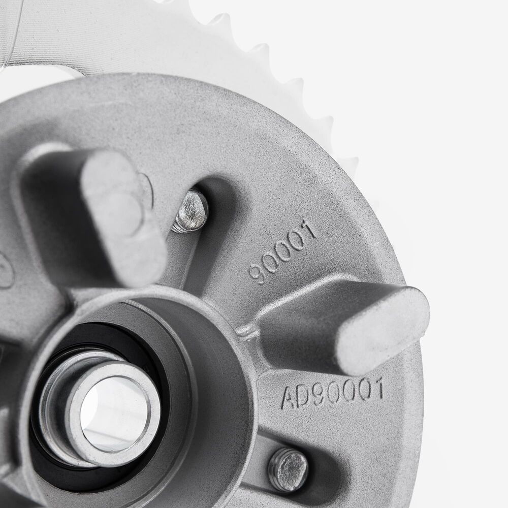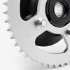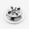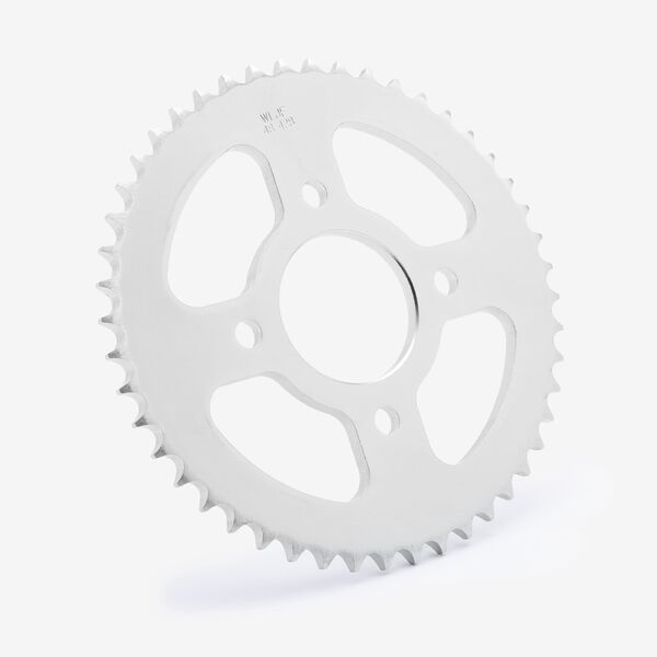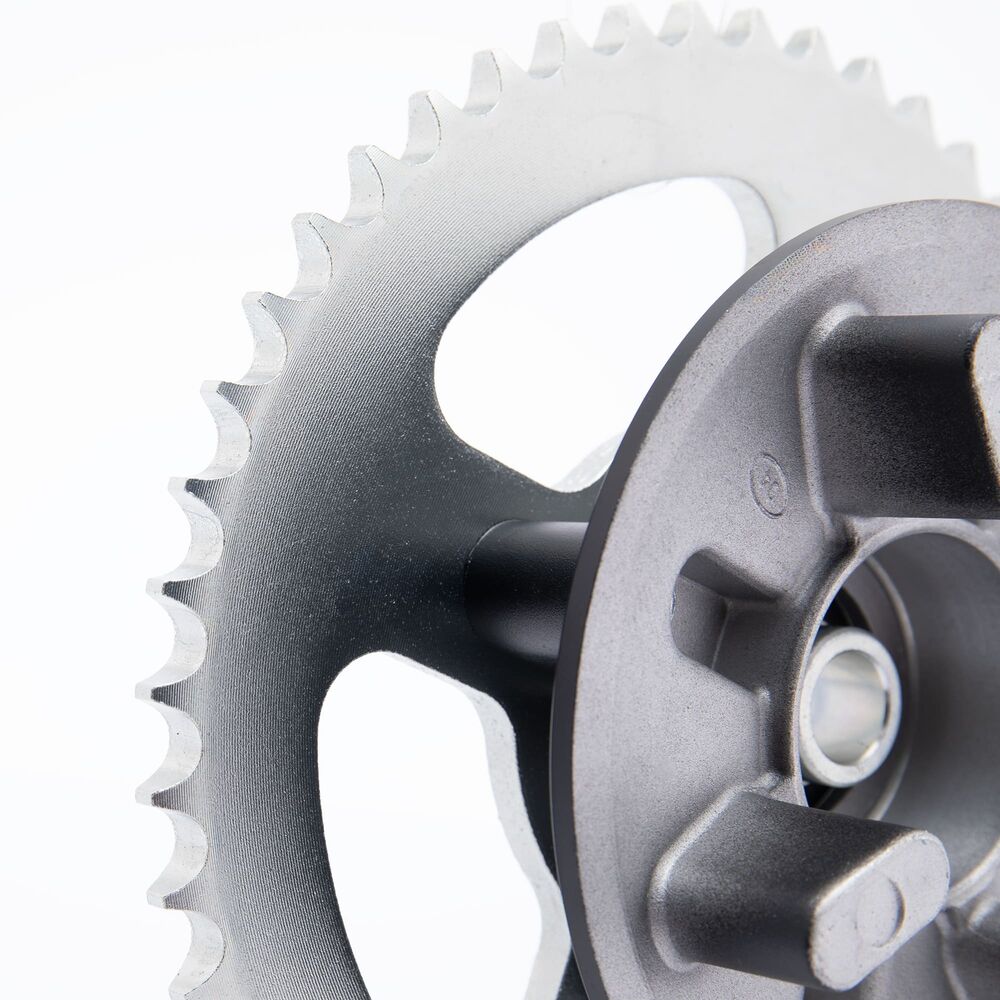 The sprocket hub is a central component that connects the sprocket to the motorcycle's wheel or drive assembly. It is typically a metal disc or plate with a central mounting area that aligns with the wheel's hub or drive shaft. The sprocket hub ensures proper alignment and stability of the sprocket, which is crucial for efficient power transfer from the engine to the rear wheel. It may include features for mounting bolts or securing mechanisms and is designed to withstand the forces and vibrations experienced during riding.