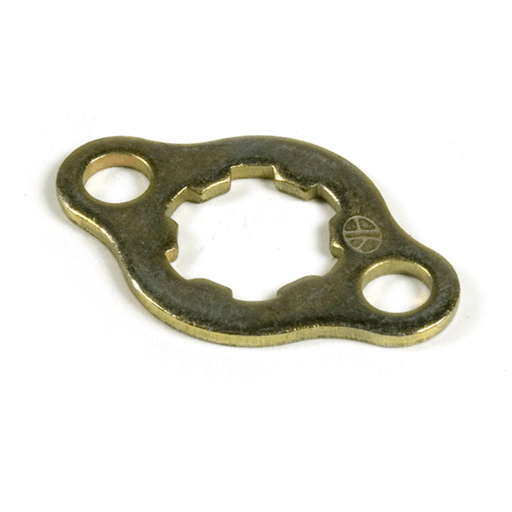 The front sprocket plate is a component that secures the front sprocket to the motorcycle's transmission or engine output shaft. Typically made from metal, it is designed to provide a stable mounting surface for the sprocket, ensuring it remains properly aligned and engaged with the chain. The plate often features mounting holes or slots for bolts that attach it to the shaft and may also have provisions for a retaining clip or washer.