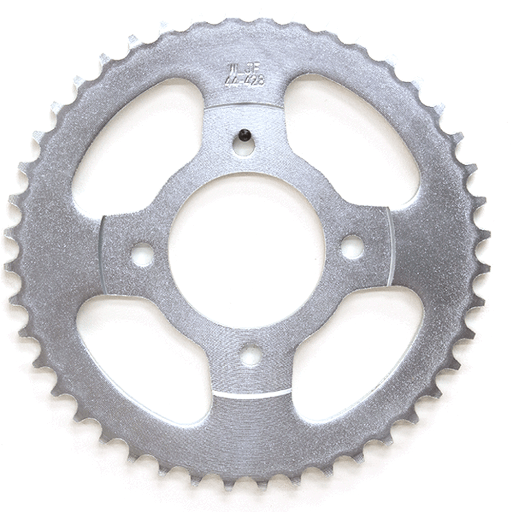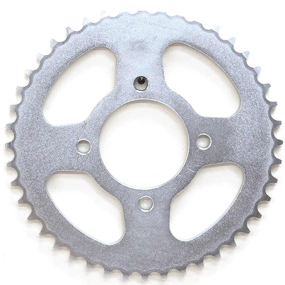 The rear sprocket on a motorcycle is a key component of the drivetrain system, located on the rear wheel hub. It works in conjunction with the front sprocket and the chain to transmit power from the engine to the rear wheel, propelling the motorcycle forward. The rear sprocket features a series of teeth that mesh with the chain, and its size affects the motorcycle’s gearing and performance characteristics. A larger rear sprocket increases torque and acceleration, while a smaller one improves top speed and fuel efficiency. Proper maintenance and alignment of the rear sprocket are essential for optimal drivetrain performance and safety.