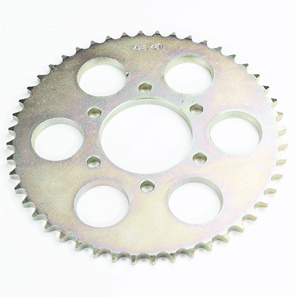The rear sprocket on a motorcycle is a key component of the drivetrain system, located on the rear wheel hub. It works in conjunction with the front sprocket and the chain to transmit power from the engine to the rear wheel, propelling the motorcycle forward. The rear sprocket features a series of teeth that mesh with the chain, and its size affects the motorcycle’s gearing and performance characteristics. A larger rear sprocket increases torque and acceleration, while a smaller one improves top speed and fuel efficiency. Proper maintenance and alignment of the rear sprocket are essential for optimal drivetrain performance and safety.