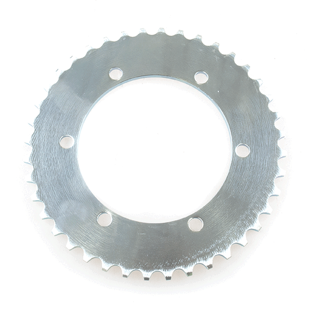 The rear sprocket on a motorcycle is a key component of the drivetrain system, located on the rear wheel hub. It works in conjunction with the front sprocket and the chain to transmit power from the engine to the rear wheel, propelling the motorcycle forward. The rear sprocket features a series of teeth that mesh with the chain, and its size affects the motorcycle’s gearing and performance characteristics. A larger rear sprocket increases torque and acceleration, while a smaller one improves top speed and fuel efficiency. Proper maintenance and alignment of the rear sprocket are essential for optimal drivetrain performance and safety.