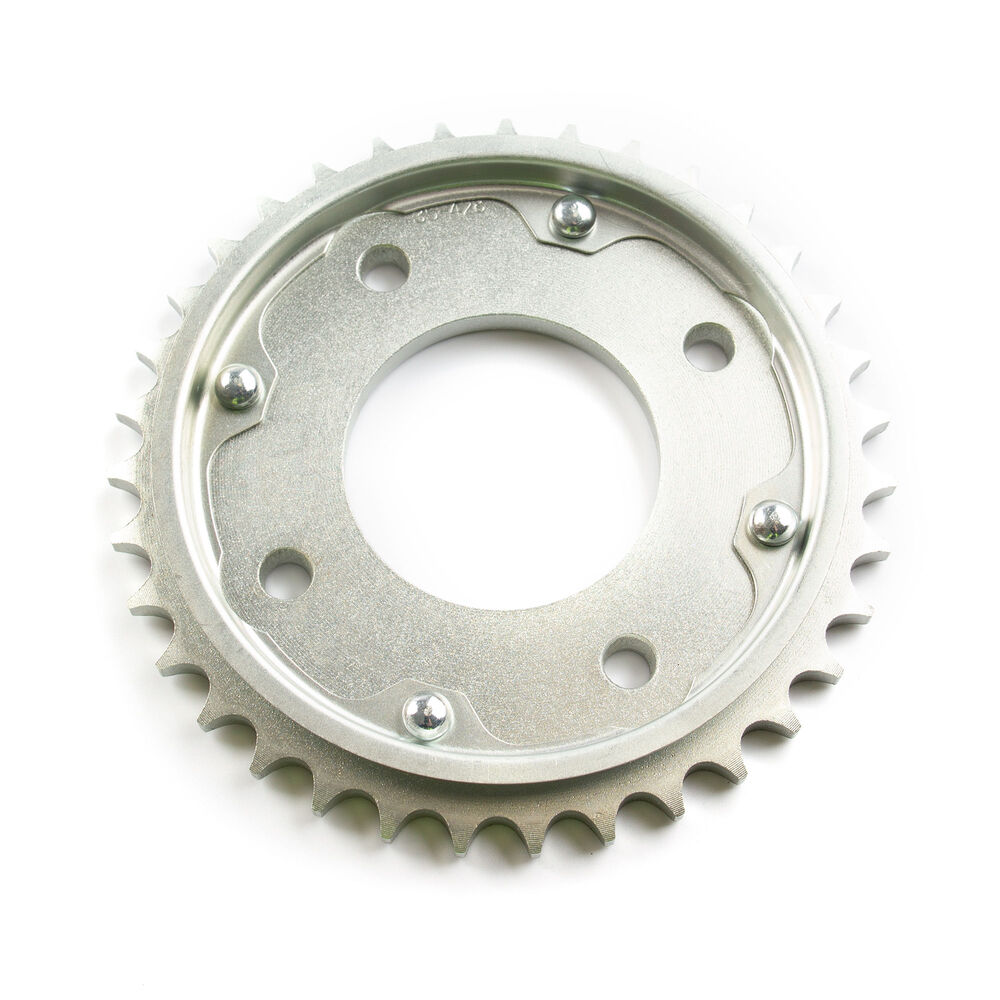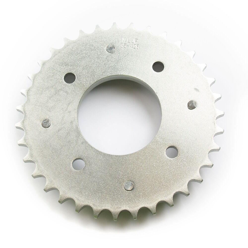 The rear sprocket on a motorcycle is a key component of the drivetrain system, located on the rear wheel hub. It works in conjunction with the front sprocket and the chain to transmit power from the engine to the rear wheel, propelling the motorcycle forward. The rear sprocket features a series of teeth that mesh with the chain, and its size affects the motorcycle’s gearing and performance characteristics. A larger rear sprocket increases torque and acceleration, while a smaller one improves top speed and fuel efficiency. Proper maintenance and alignment of the rear sprocket are essential for optimal drivetrain performance and safety.