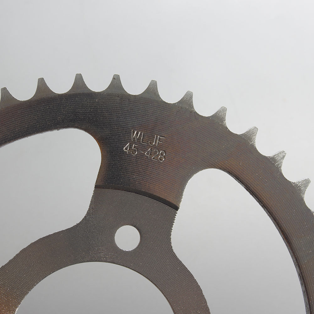 The rear sprocket on a motorcycle is a key component of the drivetrain system, located on the rear wheel hub. It works in conjunction with the front sprocket and the chain to transmit power from the engine to the rear wheel, propelling the motorcycle forward. The rear sprocket features a series of teeth that mesh with the chain, and its size affects the motorcycle’s gearing and performance characteristics. A larger rear sprocket increases torque and acceleration, while a smaller one improves top speed and fuel efficiency. Proper maintenance and alignment of the rear sprocket are essential for optimal drivetrain performance and safety.