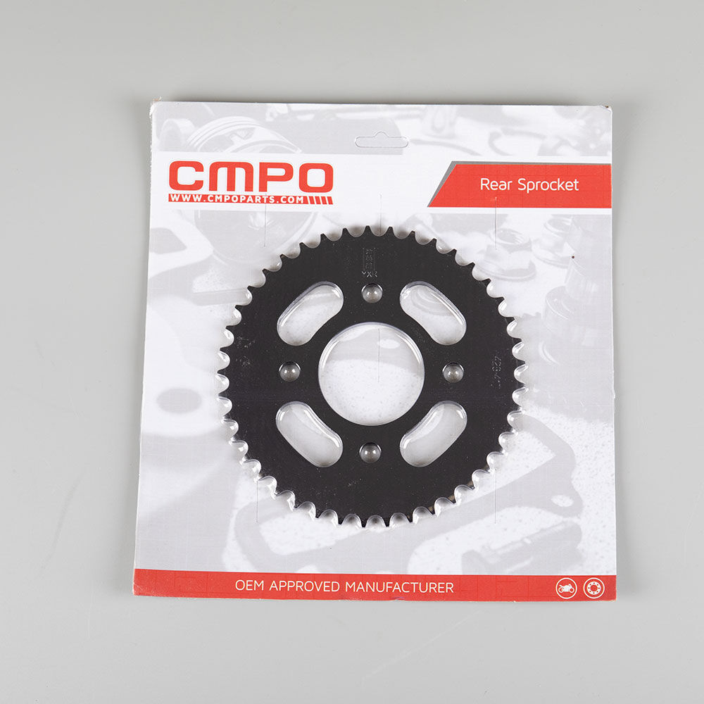The rear sprocket on a motorcycle is a key component of the drivetrain system, located on the rear wheel hub. It works in conjunction with the front sprocket and the chain to transmit power from the engine to the rear wheel, propelling the motorcycle forward. The rear sprocket features a series of teeth that mesh with the chain, and its size affects the motorcycle’s gearing and performance characteristics. A larger rear sprocket increases torque and acceleration, while a smaller one improves top speed and fuel efficiency. Proper maintenance and alignment of the rear sprocket are essential for optimal drivetrain performance and safety.