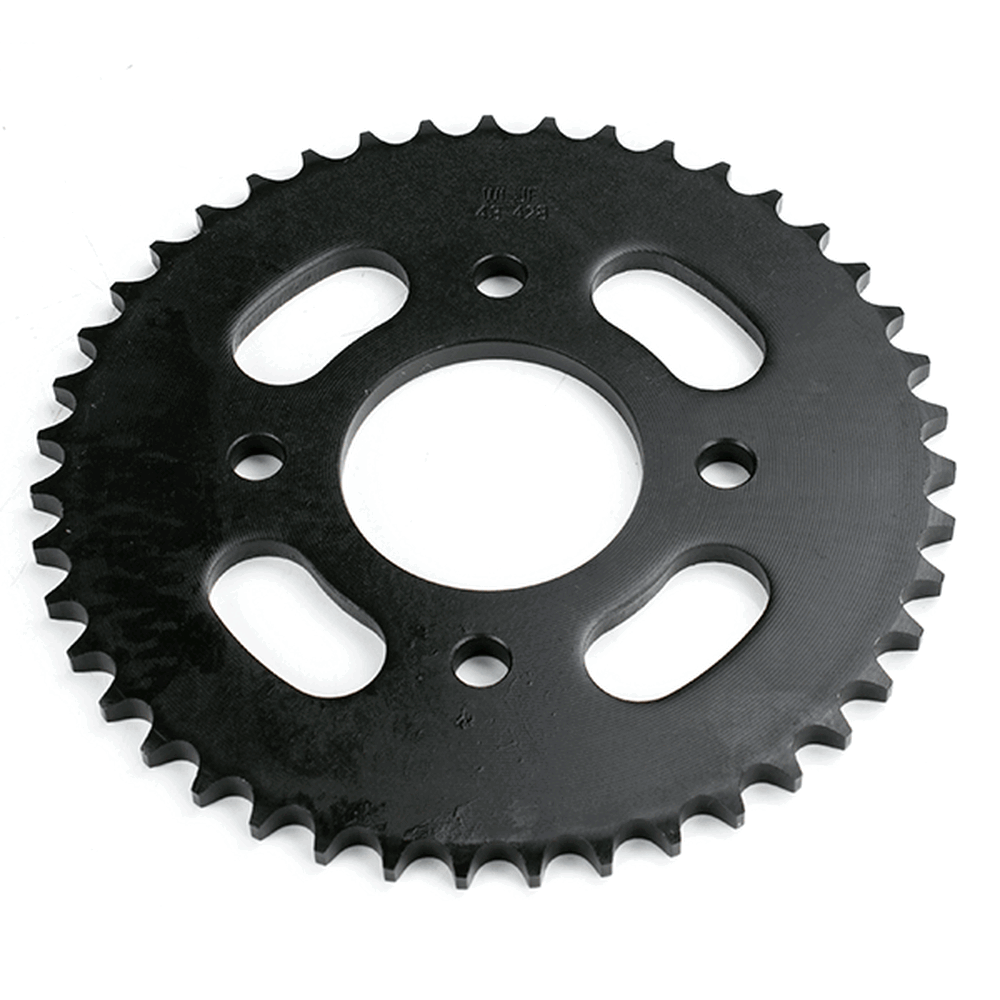 The rear sprocket on a motorcycle is a key component of the drivetrain system, located on the rear wheel hub. It works in conjunction with the front sprocket and the chain to transmit power from the engine to the rear wheel, propelling the motorcycle forward. The rear sprocket features a series of teeth that mesh with the chain, and its size affects the motorcycle’s gearing and performance characteristics. A larger rear sprocket increases torque and acceleration, while a smaller one improves top speed and fuel efficiency. Proper maintenance and alignment of the rear sprocket are essential for optimal drivetrain performance and safety.