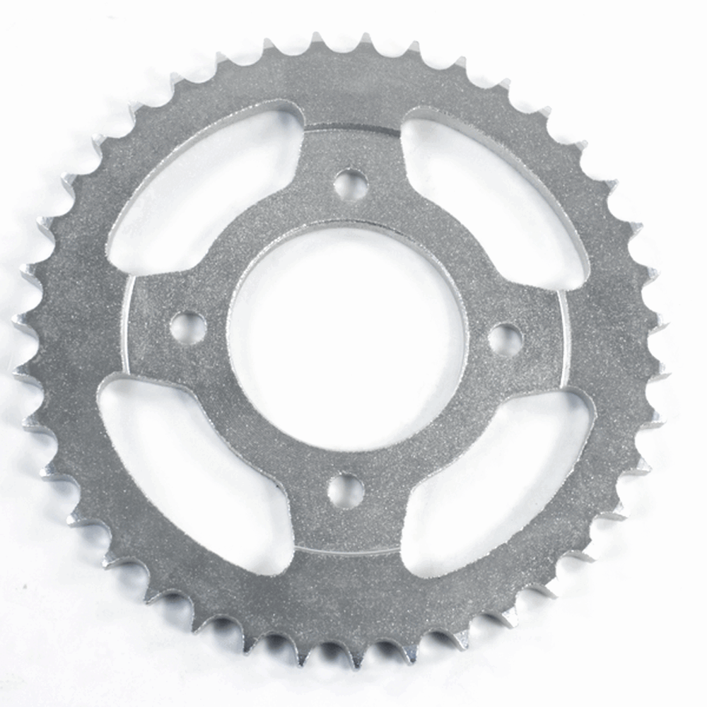 The rear sprocket on a motorcycle is a key component of the drivetrain system, located on the rear wheel hub. It works in conjunction with the front sprocket and the chain to transmit power from the engine to the rear wheel, propelling the motorcycle forward. The rear sprocket features a series of teeth that mesh with the chain, and its size affects the motorcycle’s gearing and performance characteristics. A larger rear sprocket increases torque and acceleration, while a smaller one improves top speed and fuel efficiency. Proper maintenance and alignment of the rear sprocket are essential for optimal drivetrain performance and safety.