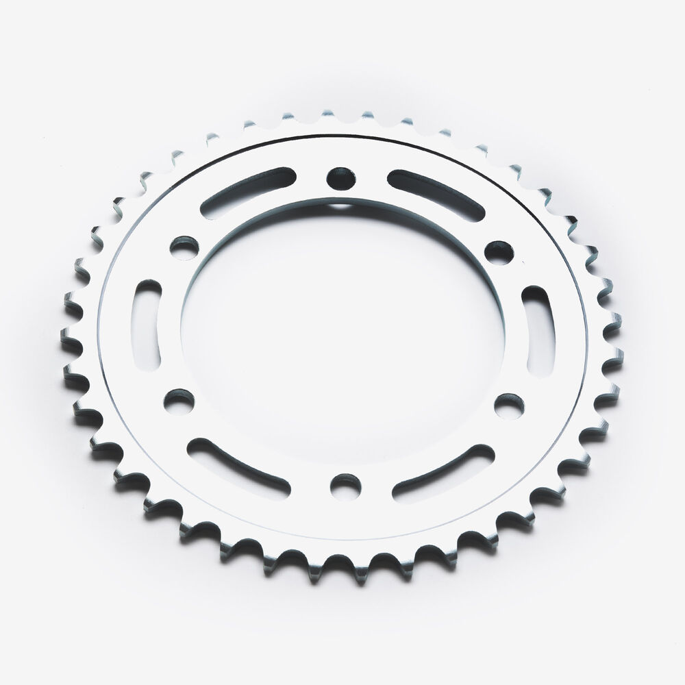 The rear sprocket on a motorcycle is a key component of the drivetrain system, located on the rear wheel hub. It works in conjunction with the front sprocket and the chain to transmit power from the engine to the rear wheel, propelling the motorcycle forward. The rear sprocket features a series of teeth that mesh with the chain, and its size affects the motorcycle’s gearing and performance characteristics. A larger rear sprocket increases torque and acceleration, while a smaller one improves top speed and fuel efficiency. Proper maintenance and alignment of the rear sprocket are essential for optimal drivetrain performance and safety.