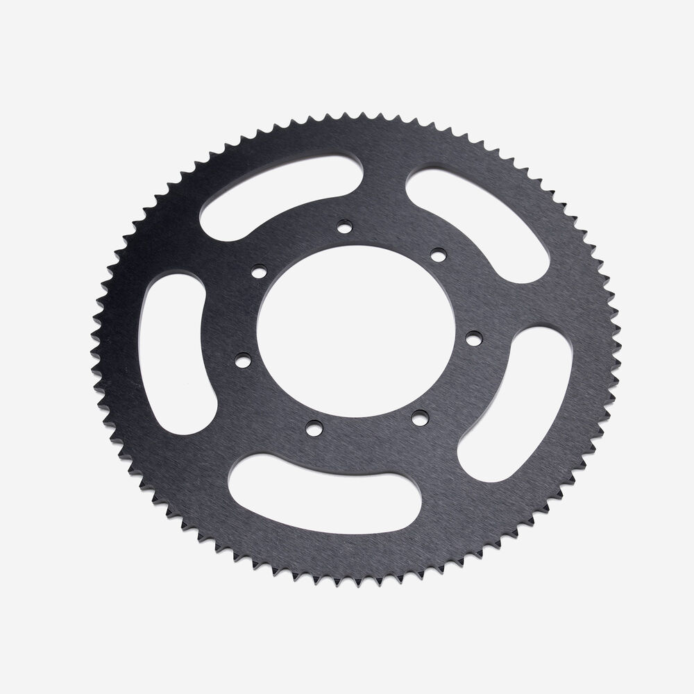 The rear sprocket on a motorcycle is a key component of the drivetrain system, located on the rear wheel hub. It works in conjunction with the front sprocket and the chain to transmit power from the engine to the rear wheel, propelling the motorcycle forward. The rear sprocket features a series of teeth that mesh with the chain, and its size affects the motorcycle’s gearing and performance characteristics. A larger rear sprocket increases torque and acceleration, while a smaller one improves top speed and fuel efficiency. Proper maintenance and alignment of the rear sprocket are essential for optimal drivetrain performance and safety.