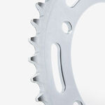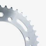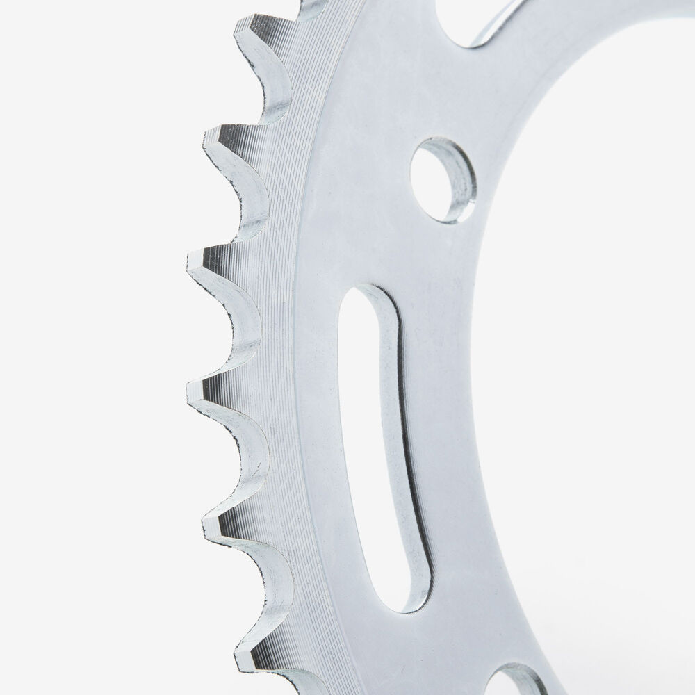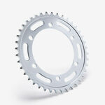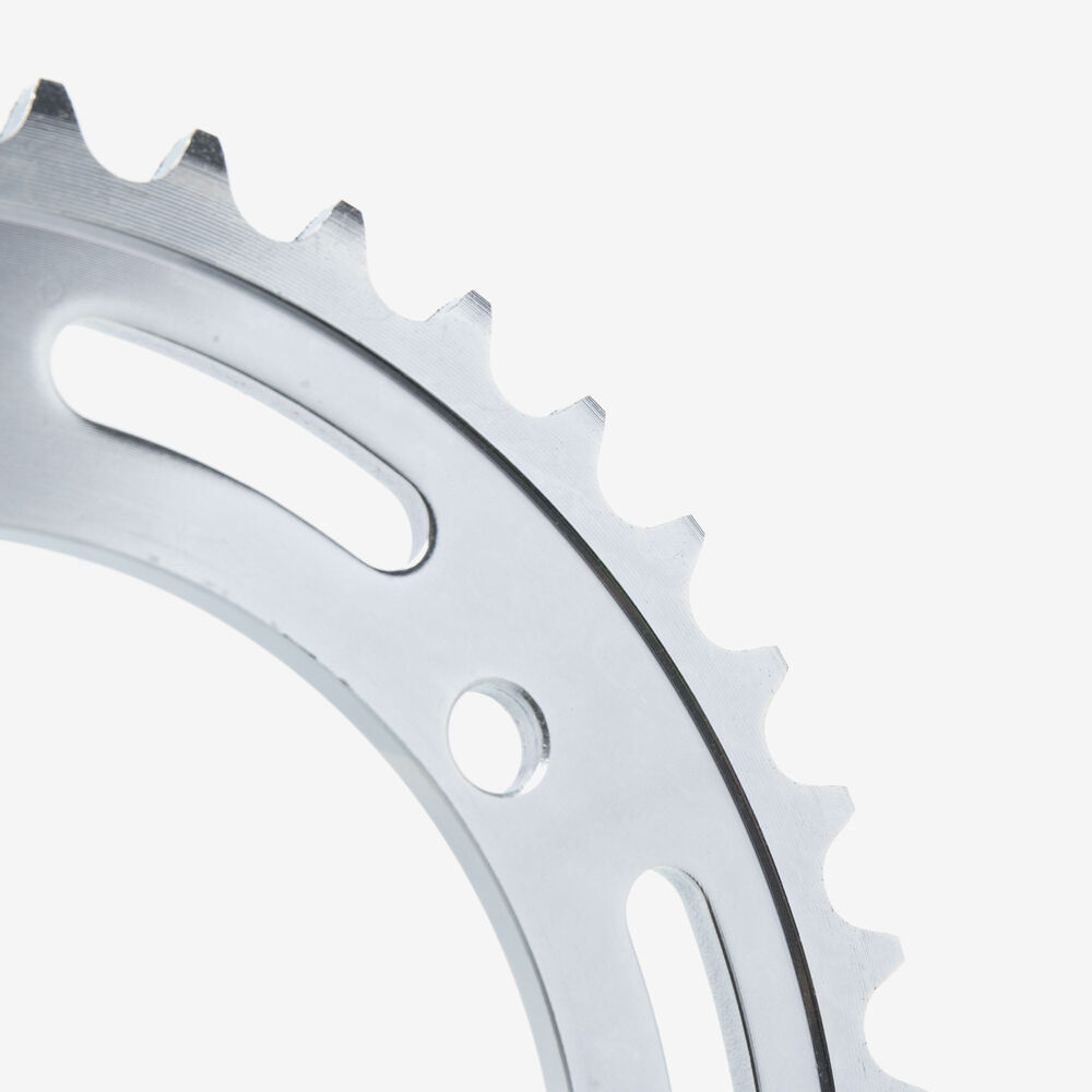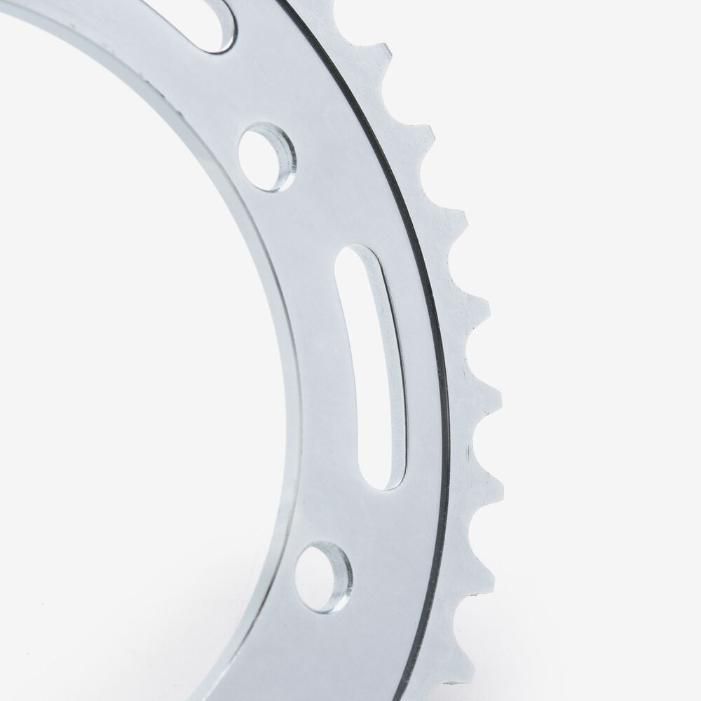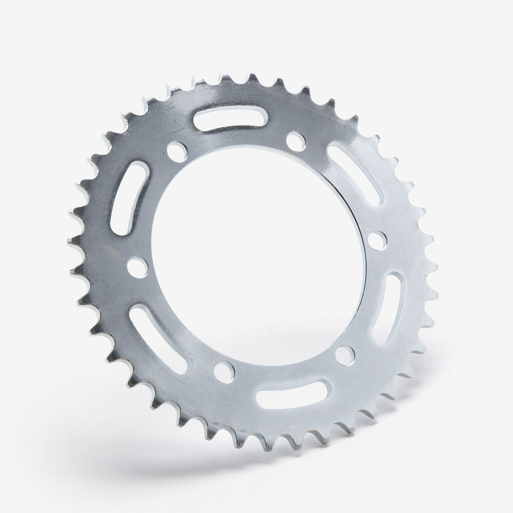 The rear sprocket on a motorcycle is a key component of the drivetrain system, located on the rear wheel hub. It works in conjunction with the front sprocket and the chain to transmit power from the engine to the rear wheel, propelling the motorcycle forward. The rear sprocket features a series of teeth that mesh with the chain, and its size affects the motorcycle’s gearing and performance characteristics. A larger rear sprocket increases torque and acceleration, while a smaller one improves top speed and fuel efficiency. Proper maintenance and alignment of the rear sprocket are essential for optimal drivetrain performance and safety.